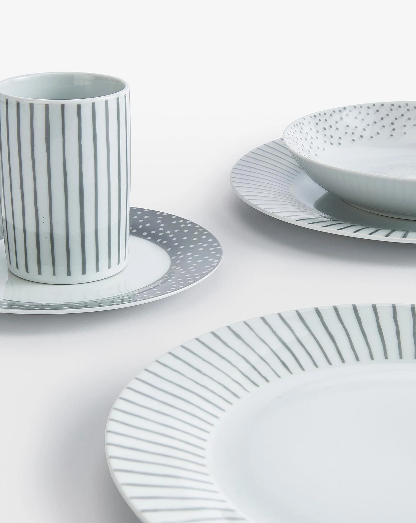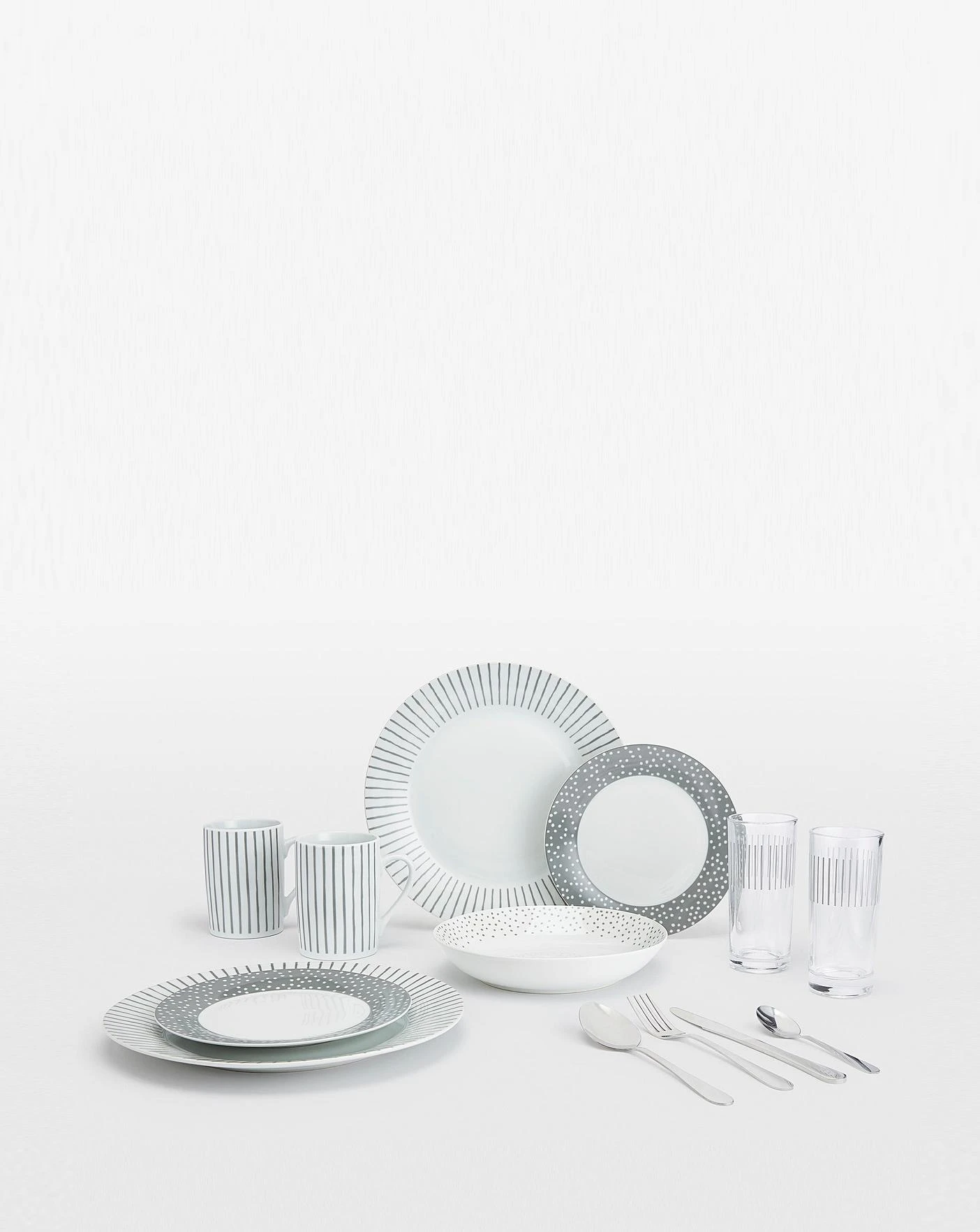 36pc Billy Grey Combo Set Includes 16pc dinner set + 16pc cutlery set + 4pc tumbler glasses. Dinner set is dishwaser & microwave safe. Cutlery is dishwasher safe and should be removed promptly and dried with a soft cloth. We recommned washing the glasses by hand.