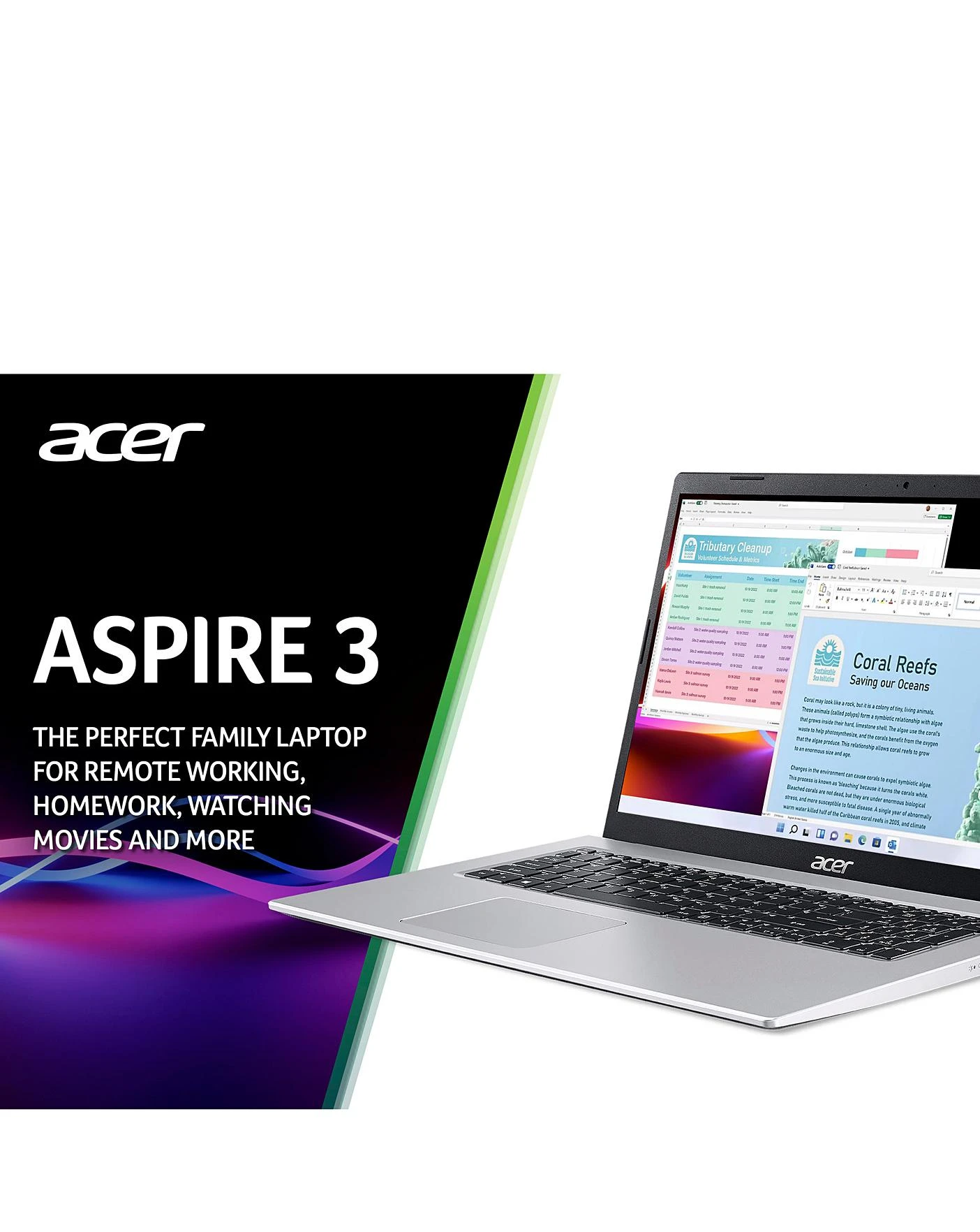 The Aspire 3 from Acer is an ideal everyday laptop, designed to meet the most common computing needs with ease.bThe huge 17.3 HD+ display is ideal for both work and play. The larger size is perfect for multi-tasking as well as media use, such as watching a move or streaming the latest boxset. Additionally, the Aspire 3 features Acer’s BlueLightShield technology which helps reduce eye strain and fatigue, particularly when using it for an extended period of time. With a speedy Intel Pentium Silver CPU and 8GB of RAM, you’ll be able to handle a wide range of tasks on the Aspire 3 – from word processing or spreadsheets to browsing the web. You also get 512GB of flash memory, for storing your documents, media and files. The Aspire 3 also features a battery life of up-to 7.5 hours from a single charge, meaning it can last an entire day at work or school without you having to worry about plugging it in to charge. The Aspire 3 comes with Windows 11 pre-installed to give you the very best performance, the latest design and seamless integration of services such as Microsoft 365 and Microsoft Teams. All of this combines to give you the best Windows experience ever. The Aspire 3 features a full complement of connectivity options, for maximum convenience. Integrated dual-band Wi-Fi 5 not only allows you to get online easily but helps to minimise drop-outs and lag as well, while the 3 USB ports and HDMI port ensure you can connect a wide range of accessories and external displays without any hassle. This versatility means the Aspire 3 is perfect for families where it will be used by a number of people, especially if the kids need to do homework. It’s also a great choice for students, who will need a laptop to complete their coursework as well as being using for entertainment and casual needs.