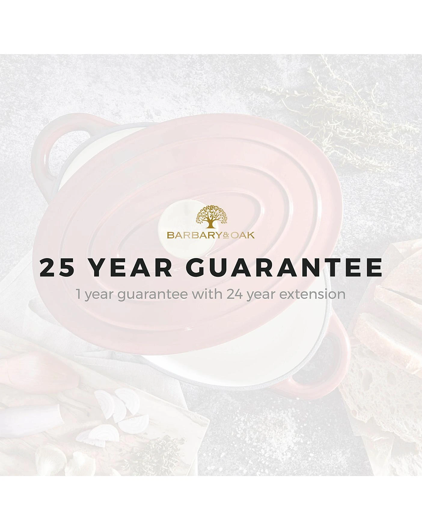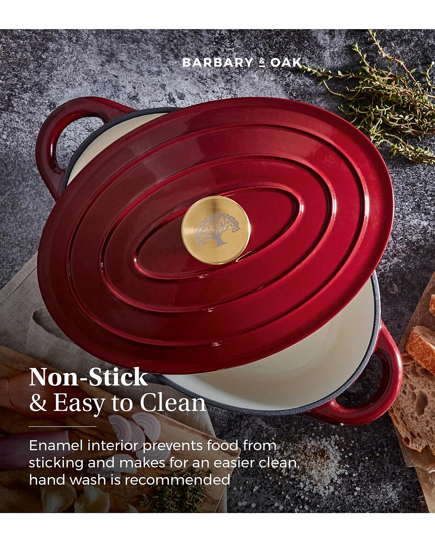 This Barbary & Oak 29cm Oval Casserole Dish features quality cast iron that is durable and built to last. Cast iron retains heat, meaning it keeps food warmer for longer.. The enamel interior prevents food from sticking, is easy to clean, and will not absorb odours or flavours. Versatile in design, the casserole dish is suitable for all hob types including induction and also grill and oven safe up to 260 degrees celsius. A domed lid is included, which helps lock in and retain all the moisture to ensure your food is tender with an enhanced flavour. Crafted with 2 handles, they provide an easier grip for carrying food from the oven to the table. 25 YEAR GUARANTEE: Trusted Tower quality with a standard 1 year guarantee and optional 24 year extension, subject to product registration online.