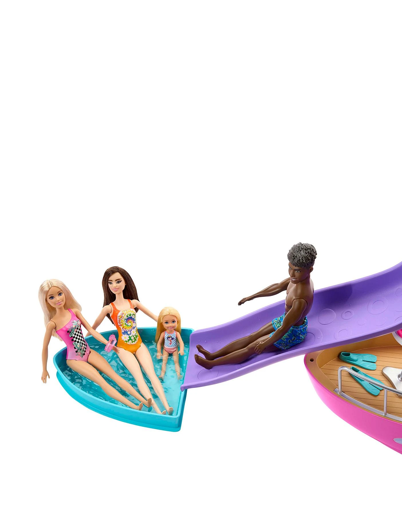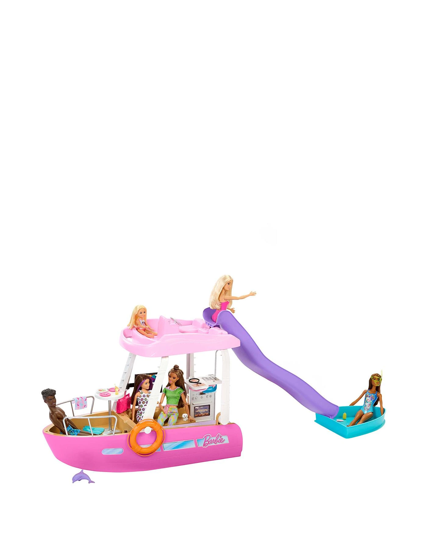 Make waves with the Barbie Dream Boat! This playset is decked out with premium details like a pool, slide, two different transformations, and so much more. Barbie doll can climb to the top deck to steer the boat and relax in the sun, then slide down into the pool! Kids can even remove the top deck for easy play access. Doll not included. Six play areas include a bathroom, sun deck, pool and slide, bedroom, kitchen and living room. Transform the living room and kitchen into a bedroom and bathroom in just a few seconds! This Barbie boat comes with 20+ pieces! There are water-themed accessories like fins and a snorkel, as well as fun extras like an underwater camera, food, drinks and even a boombox. A puppy and dolphin make great animal friends to accompany Barbie doll on her high-sea adventures! Take to the sea in style with the Barbie Dream Boat!
