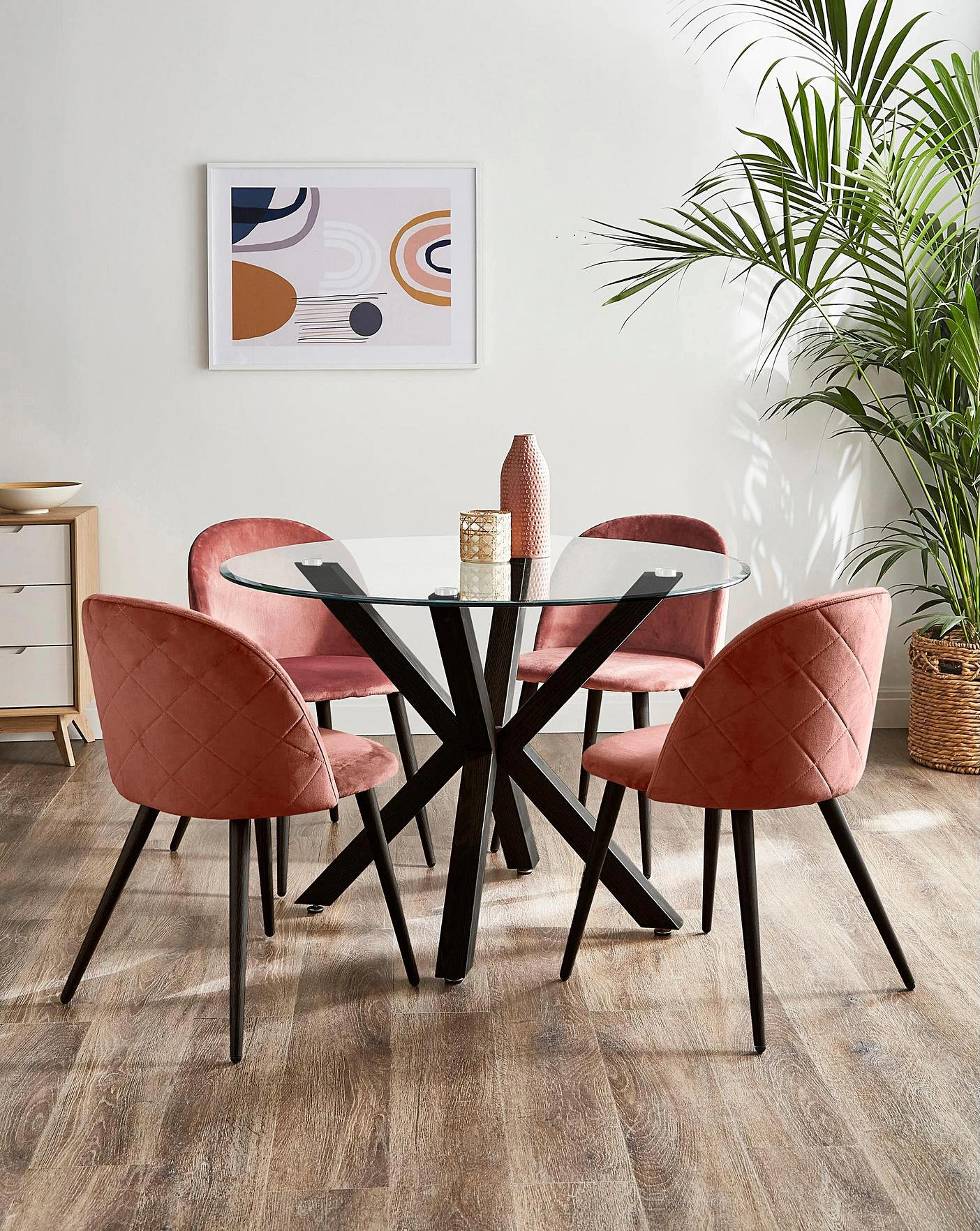 Uplift your dining space with the modern & stylish Bodie Dining Table, part of At Home Collection. Characterised by its industrial-style cross-legged design, this range is stylish and functional, making it an ideal addition to any modern dining room or kitchen. Features a round tempered glass top with bevelled edges with black powder coated metal legs.