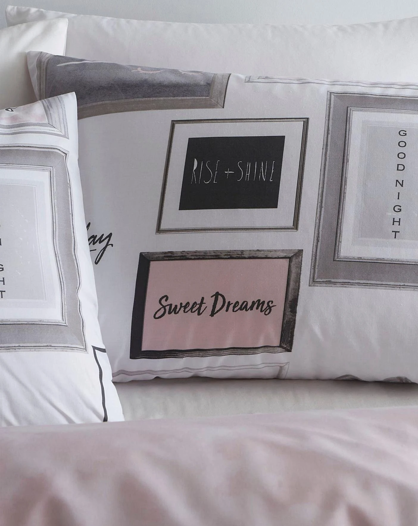 A feel-good print of fun slogans in an on-trend colour palette and contrast fully reversible soft ochre texture reverse turns a room into a happy zone of positive vibes. Catherine Lansfield is renowned for style and quality – designed and developed in Great Britain. Made to quality and human-ecological safety standards, in accordance with MADE IN GREEN by OEKO-TEX.