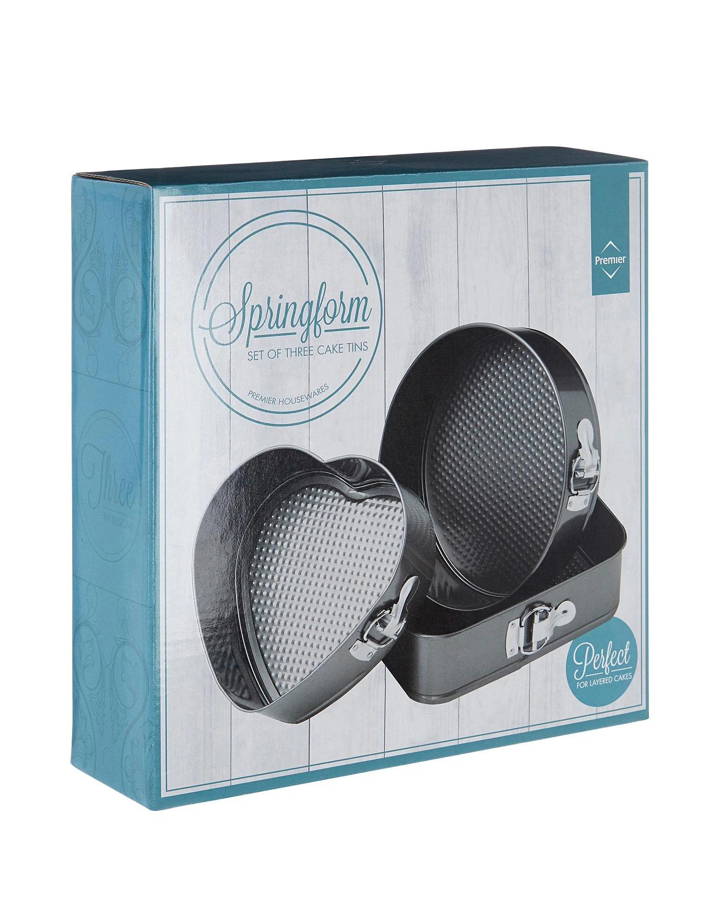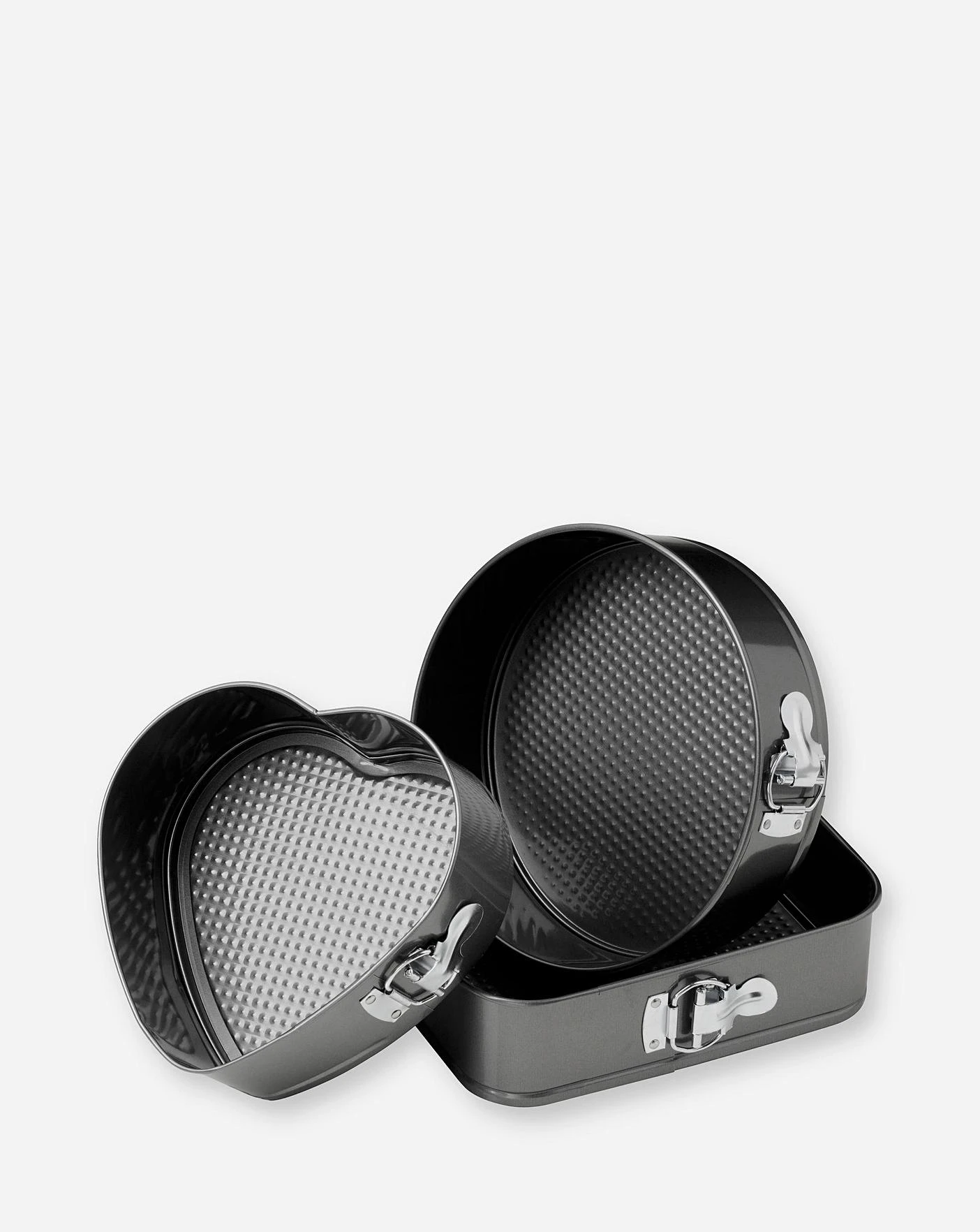 Ideal for all budding chefs, the set of three carbon steel with non stick coating cake tins will help create a wonderful treat for family, friends and yourself. Coming in square, round and heart shapes, they will help to make the occasion more memorable. The simple, yet effective, spring form sides simply detach from the base making it easier for you to remove the cake when ready to serve. A non stick coating ensure there won’t be any sticky issues when removing the cake. Being dishwasher safe allows you to concentrate on enjoying the lovingly baked homemade dessert and less time on cleaning. Strong and durable for everyday use, the set of three round cake tins would make a perfect addition to your cookware.