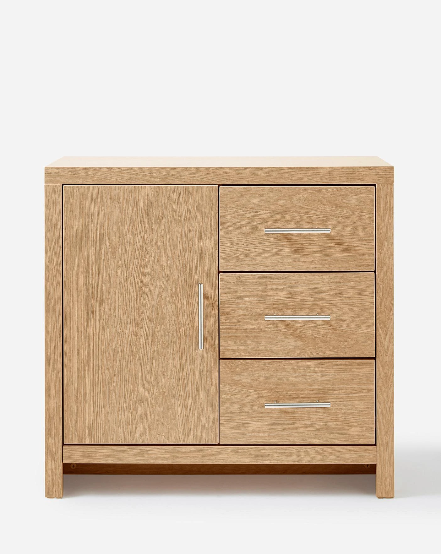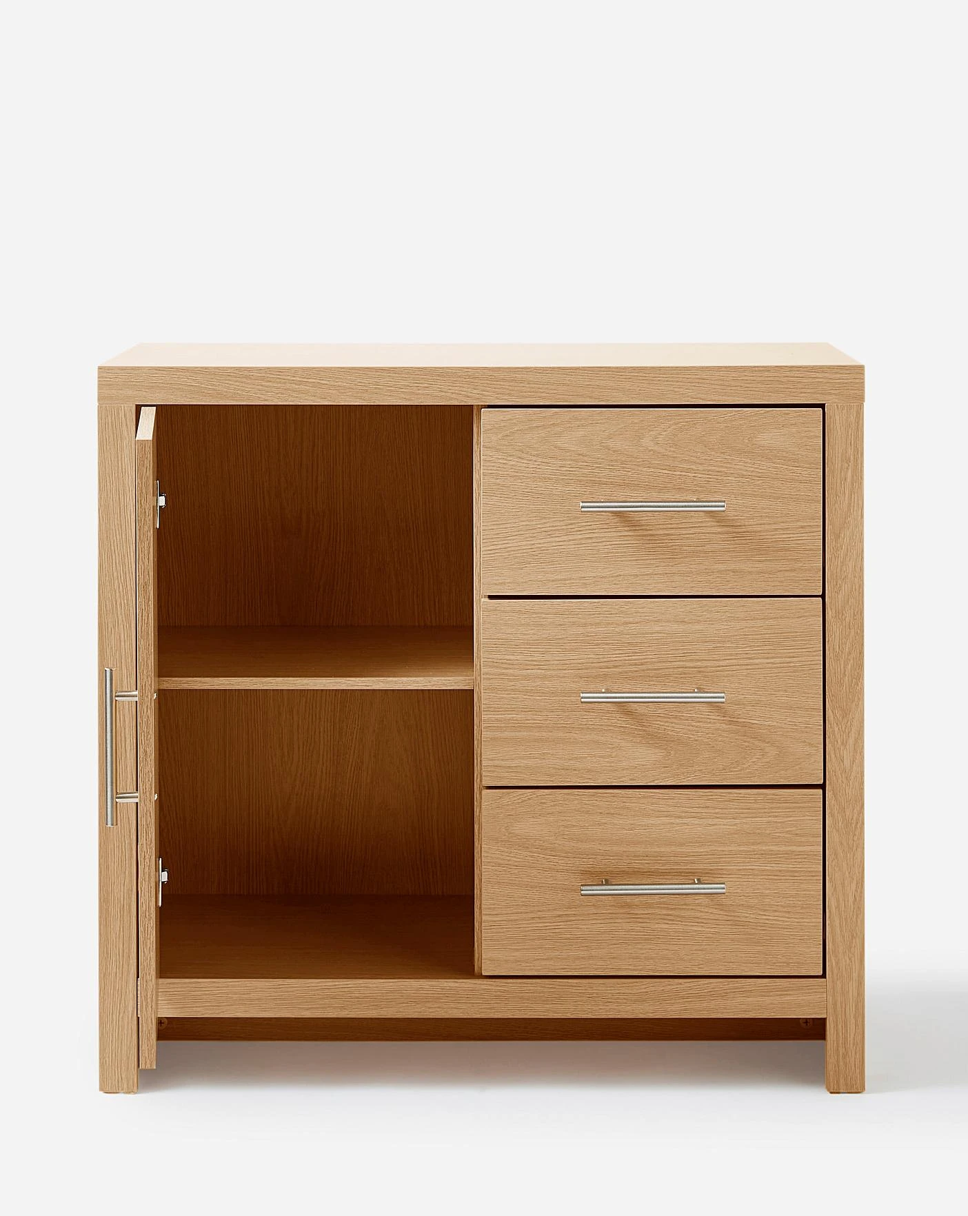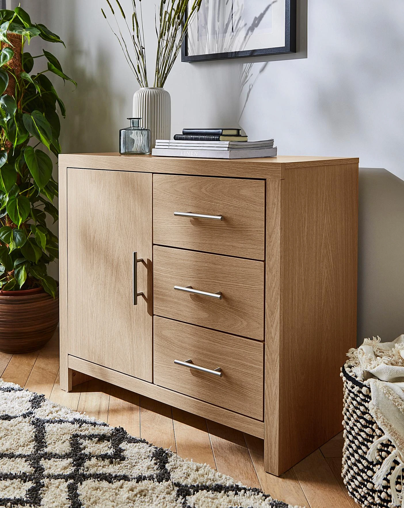 Part of At Home Collection, the Dakota Living range is a great value range, ideal for transforming your living space. The Compact Sideboard consists of three drawers and one cupboard to keep all your essentials handy, with slim metal handles and easy glide runners, covering all your storage needs and giving your space a modern makeover.