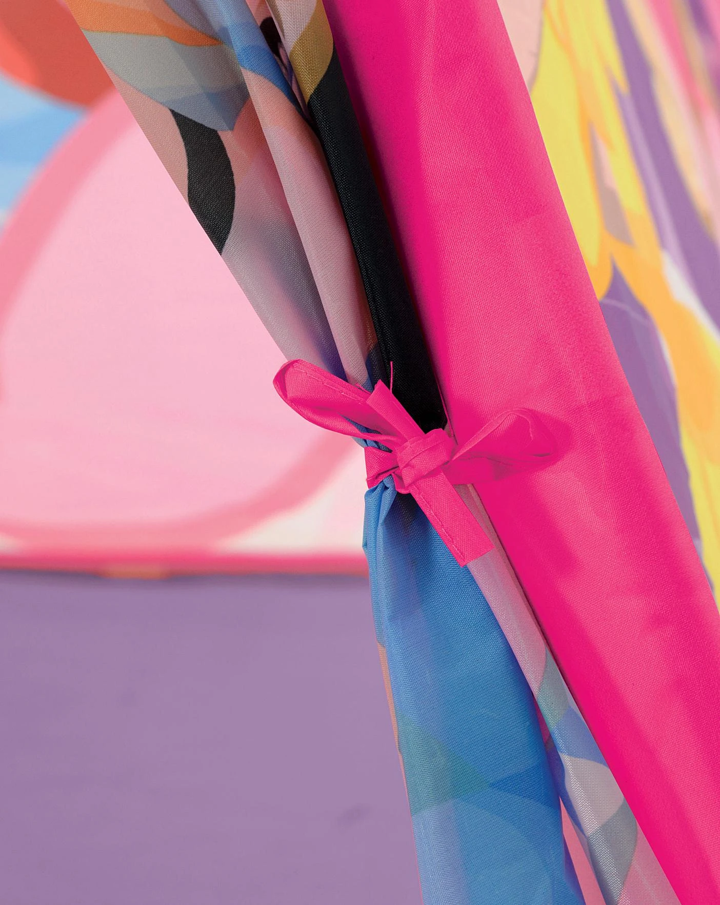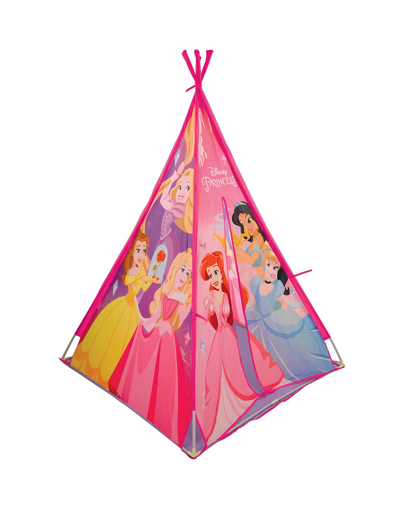 Make a secret den or hideaway. Beautiful Princess Wigwam with sturdy poles and tie-back doors. 190T polyester material. PVC poles with fabric cover. Closed top. Beautiful Princess graphics. Integrated floor. Tie-back front flaps.