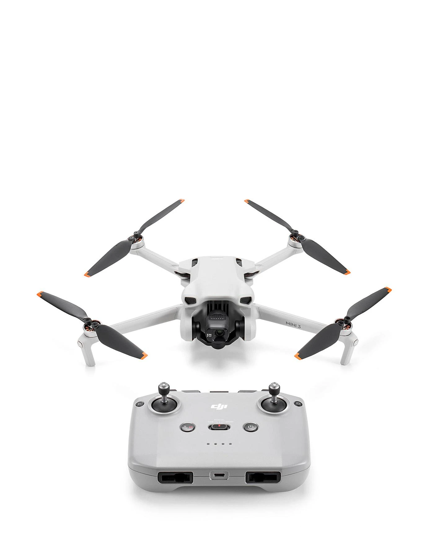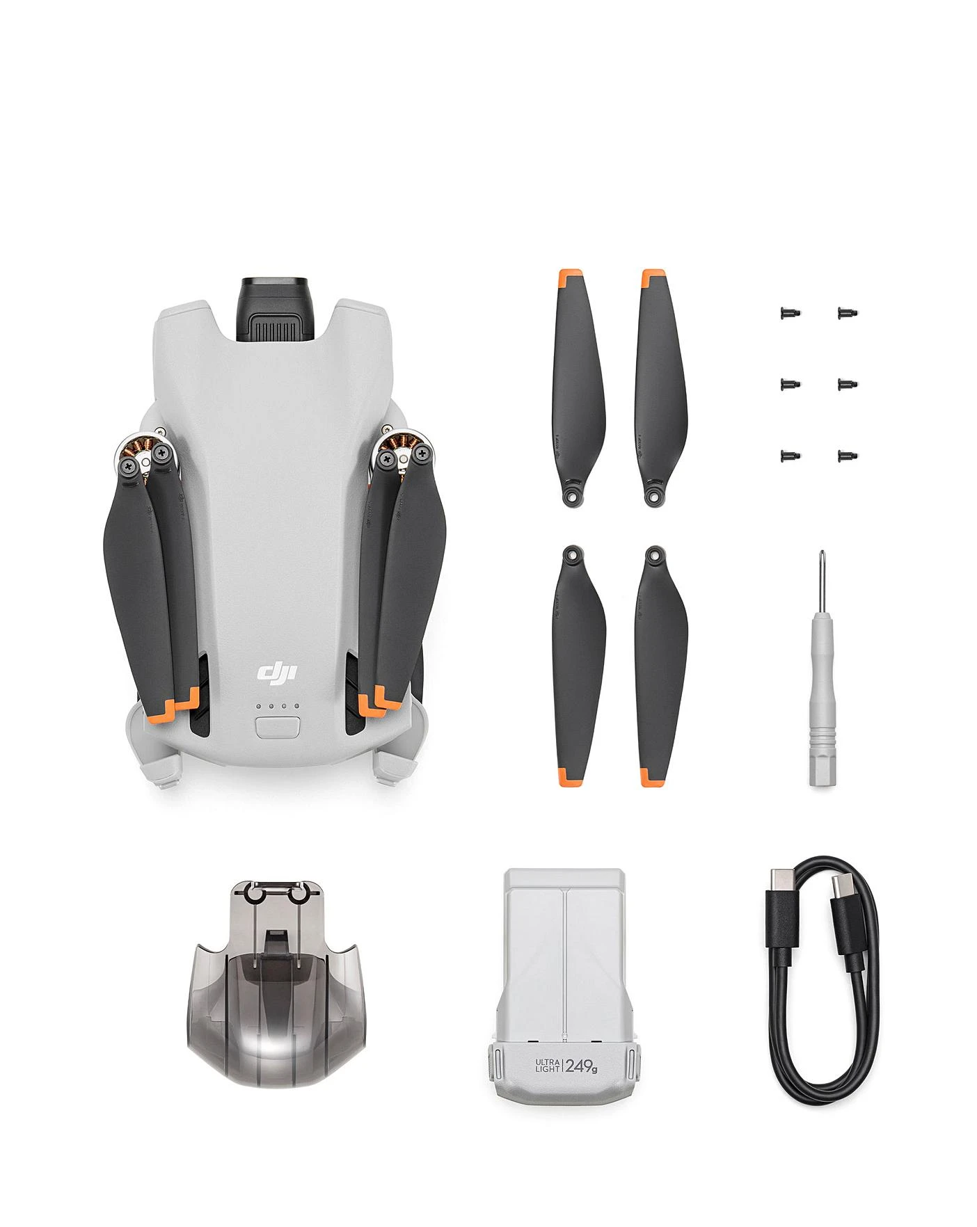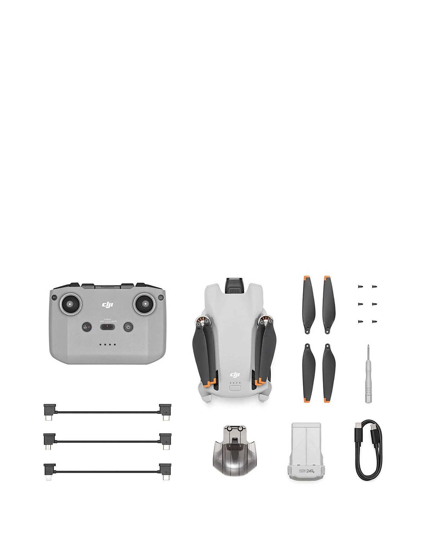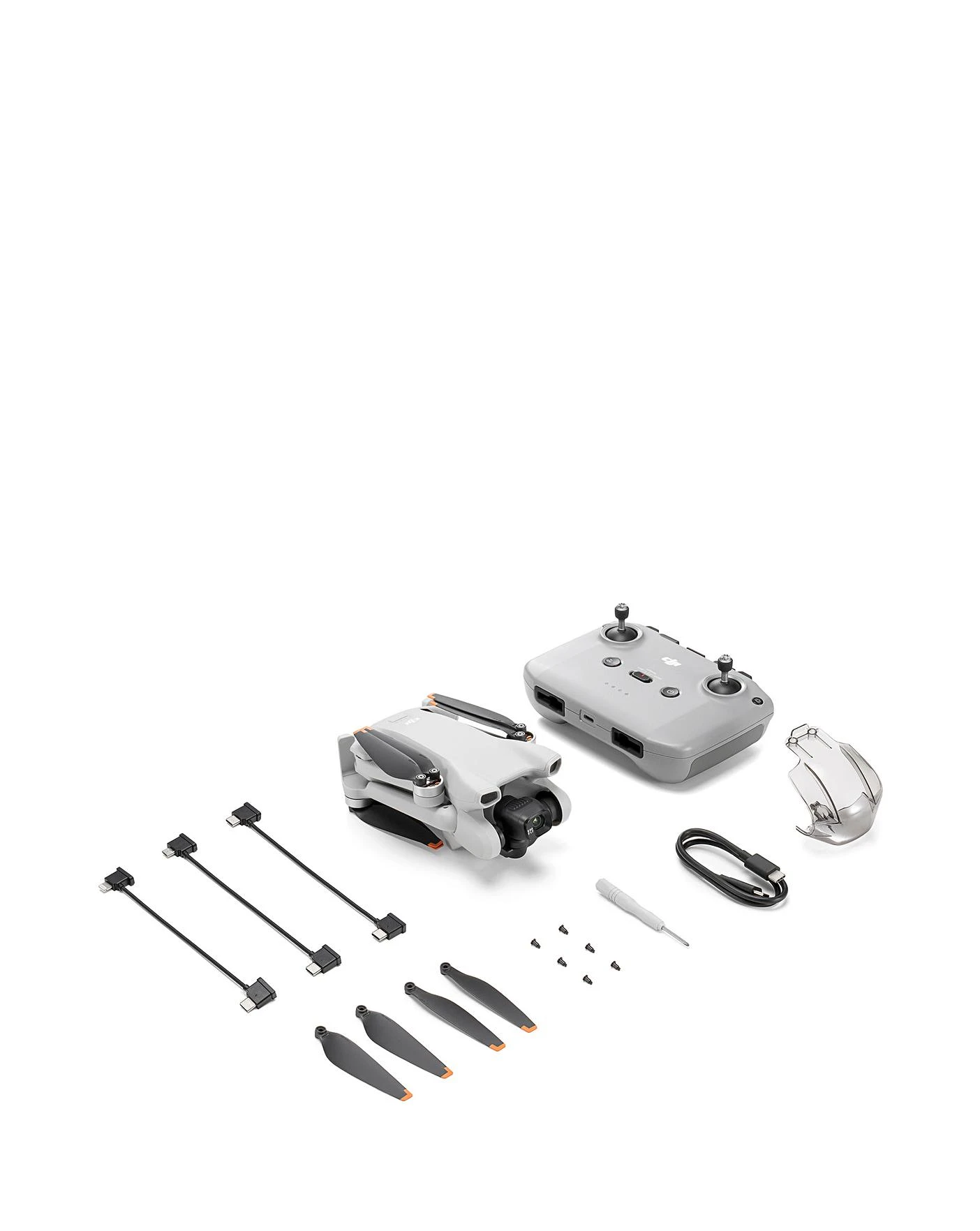 In the box: DJI Mini 3 × 1. DJI RC-N1 (remote Controller without screen) × 1. DJI RC-N1 RC Cable (USB Type-C Connector) × 1. DJI RC-N1 RC Cable (Lightning Connector) x 1. DJI RC-N1 RC Cable (Standard Micro-USB Connector) × 1. Intelligent Flight Battery × 1. Spare Propellers (Pair) × 1. Spare Screws × 6. Screwdriver × 1. Gimbal Protector × 1. Type-C to Type-C PD Cable × 1.