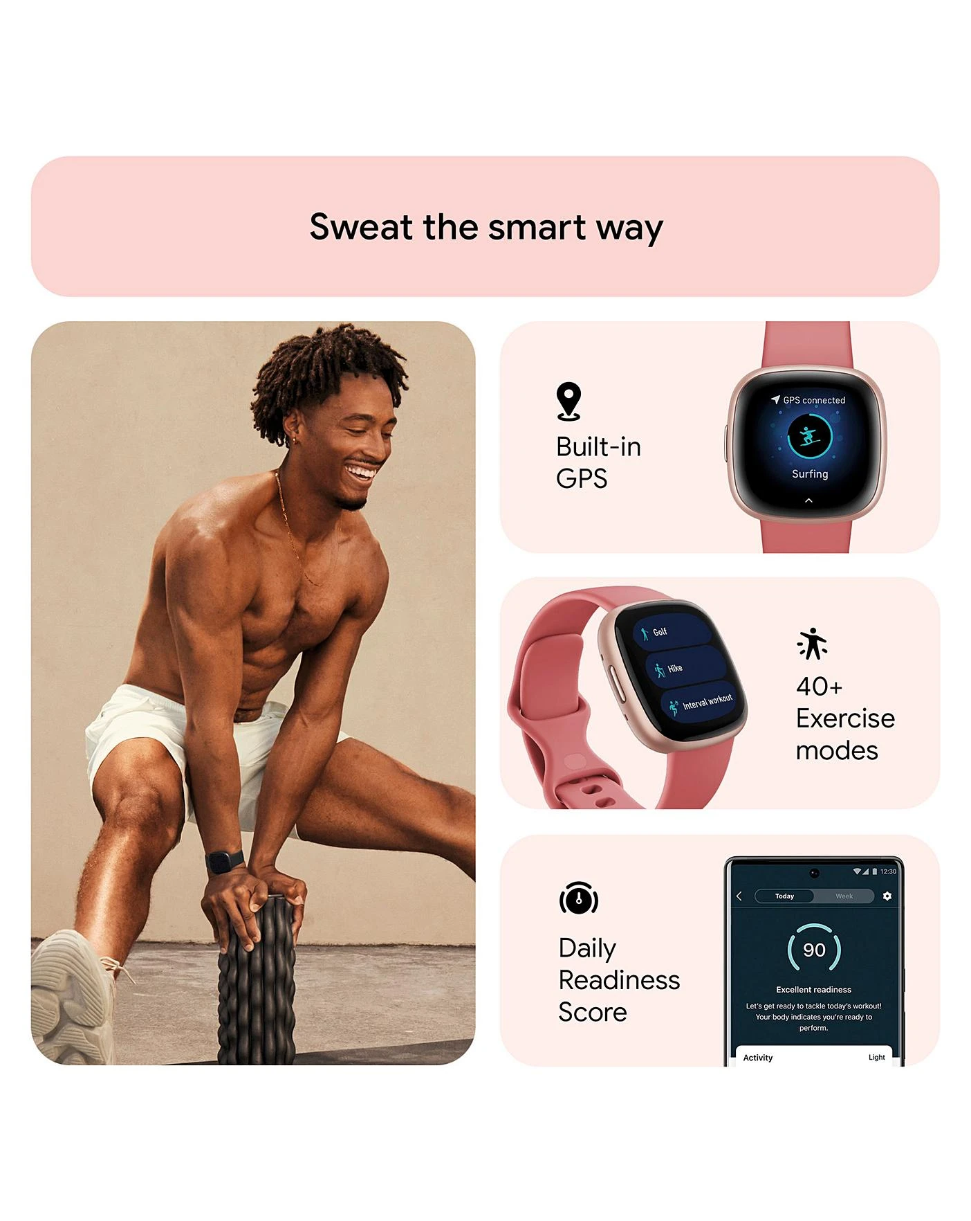 Get better results from your workout routine with all-new Versa 4 + Premium. Know when you’re up for a challenge or need a recovery day with your personalised Daily Readiness Score. Track more exercises than ever right from your wrist with 40+ exercise modes. Choose from modes like strength training, HIIT, running, kayaking and more to see key stats in real time – including Active Zone Minutes which shows your target intensity levels. Do it all with a thin, lightweight fitness smartwatch designed for comfort during workouts, sleep and more. Plus, never miss a beat with texts and notifications right on your wrist and a battery life of 6+ days.