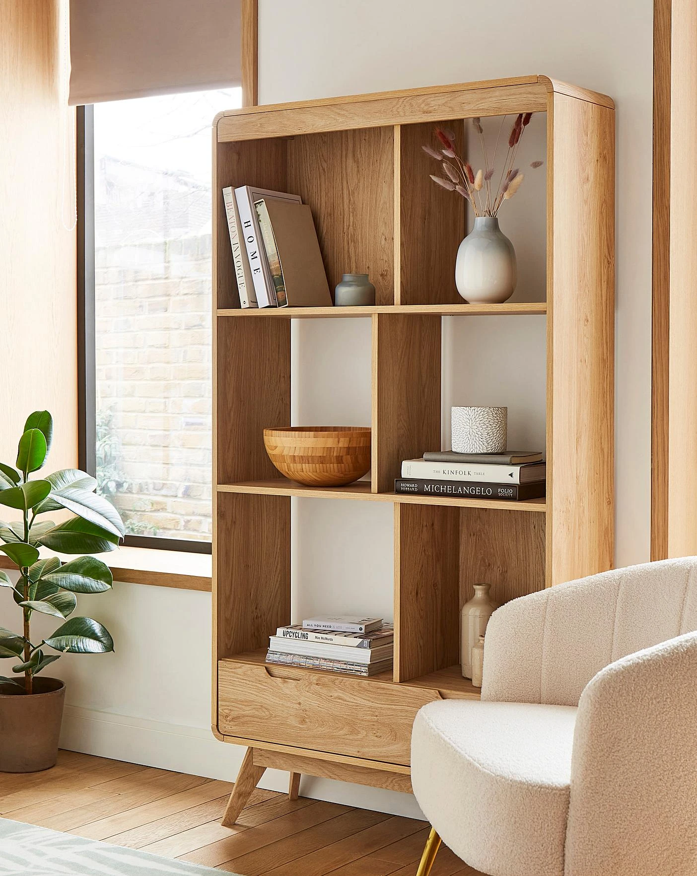 With its beautifully curved retro edges and handleless design, the Oslo Living Range combines practicality and style. The Display Unit features one long drawer and six shelves, perfect for keeping your essentials tucked away neatly and your favorite accessories on show.