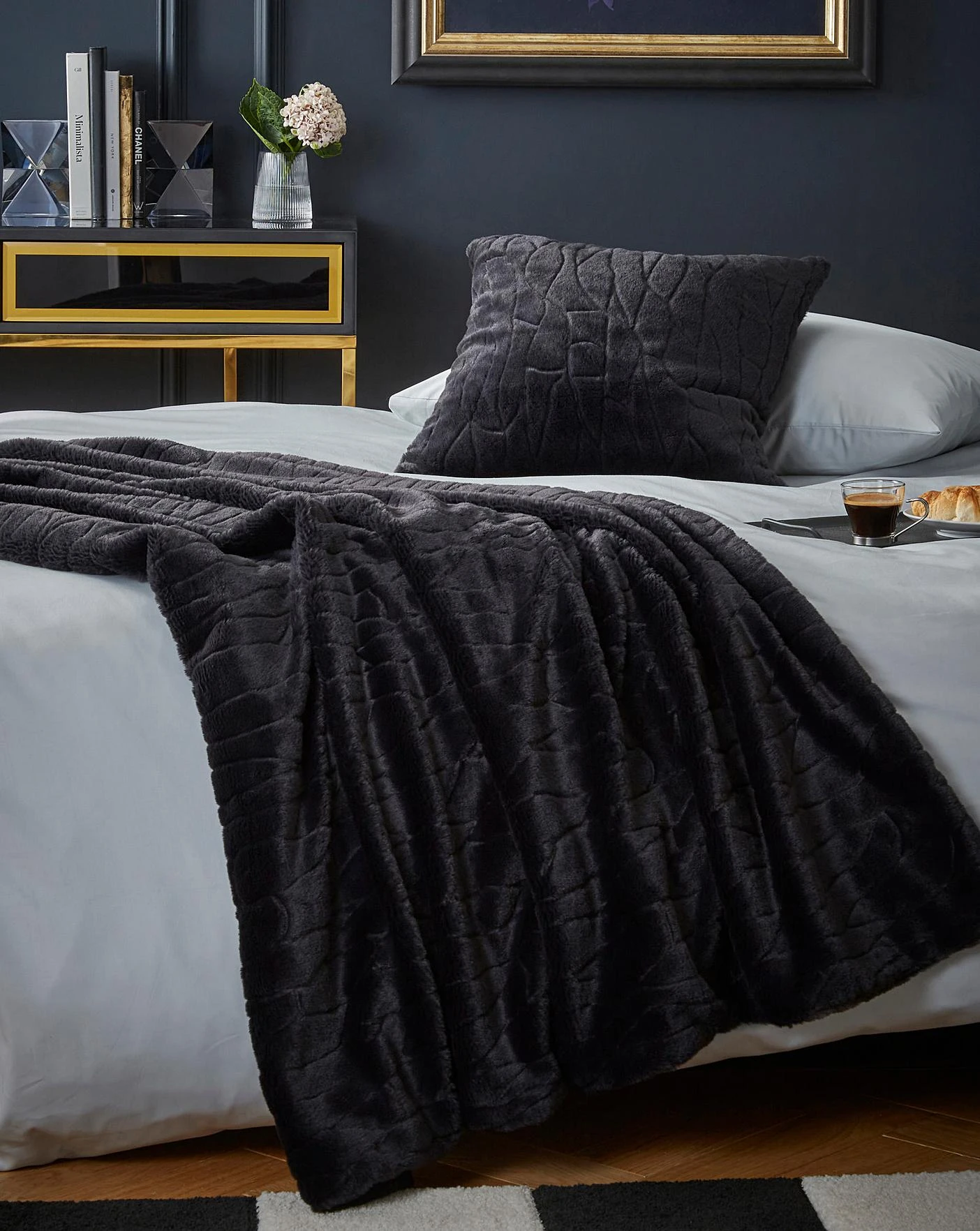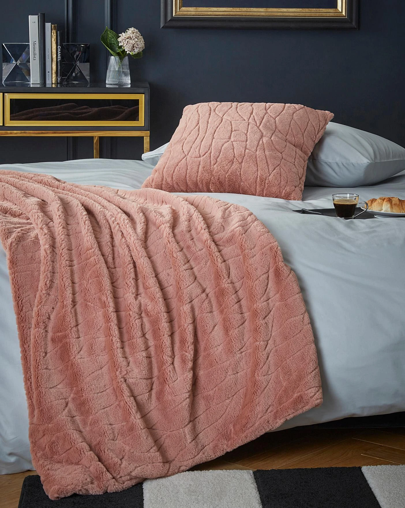 Throw with fleece back and textured, clipped faux fur front.