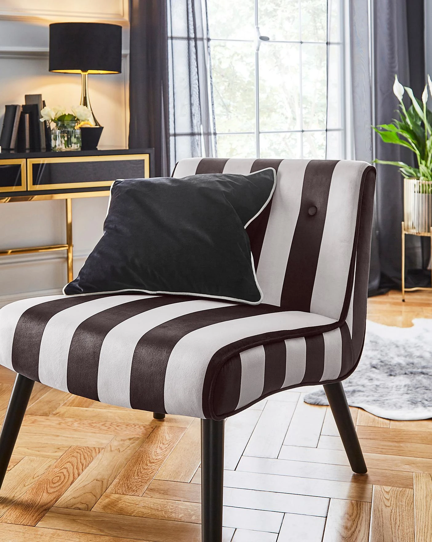 Part of the Joanna Hope Brand, our Eliza Black and White Striped Accent chair is a showstopping piece. Designed in a dramatic velvet stripe, the glamourous style with a contemporary touch is why it belongs to the Joanna Hope brand. With its low structure and soft cushioning back, it is comfortable yet incredibly stylish.