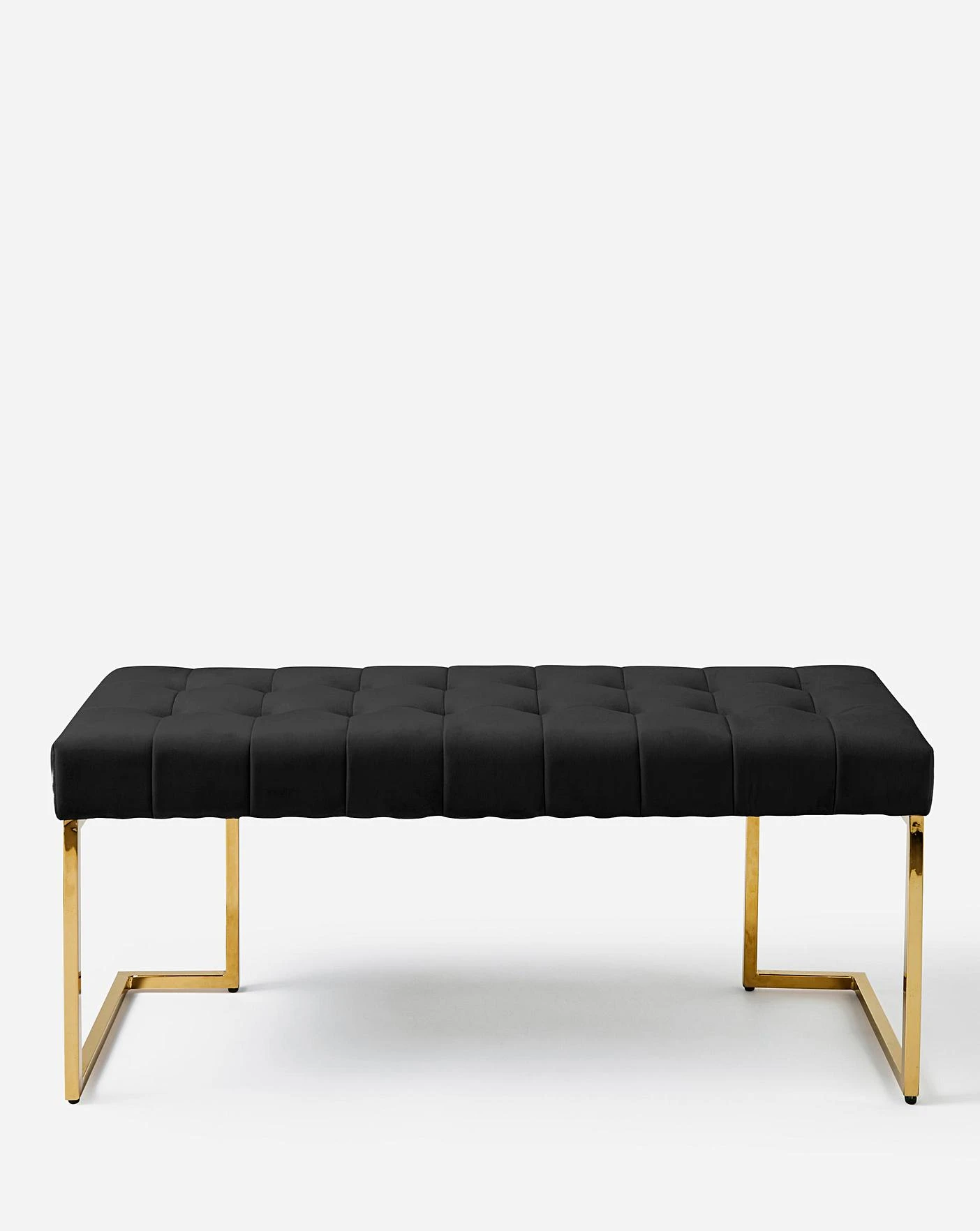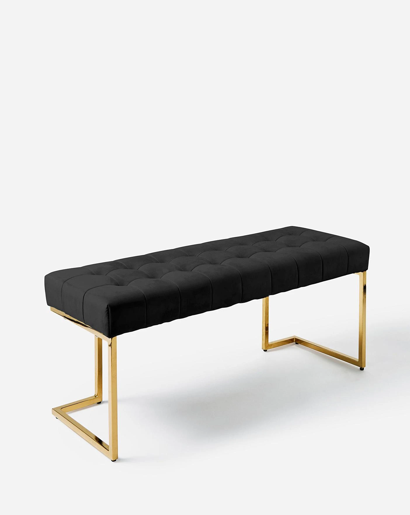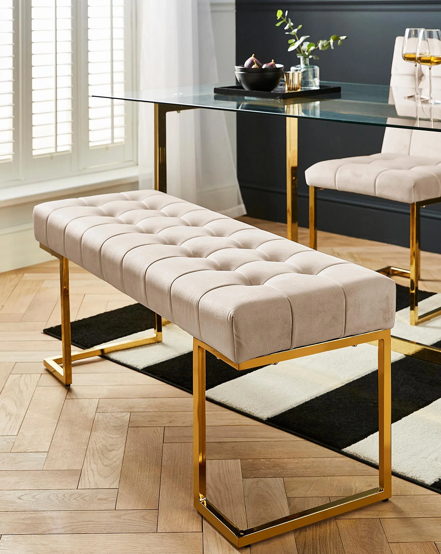 Part of the Joanna Hope brand, the Fallon Dining Bench features a gold, metallic leg structure and cushioned, buttoned detailed seat, in a velvet fabric.