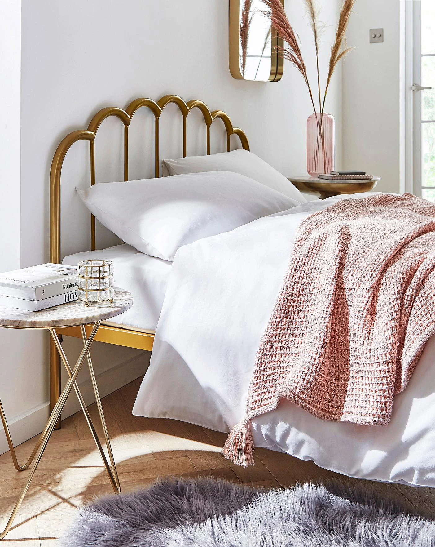 Part of the Joanna Hope Brand. The Vivienne Scalloped Bed combines glamourous tones with modern shapes while offering a practical sleep space. With its scalloped attached headboard, this bed frame can become a statement piece in your bedroom. Finished with a gold metallic style paint, The Vivienne Scalloped Bed has a raised frame which can be utilized for underbed storage.