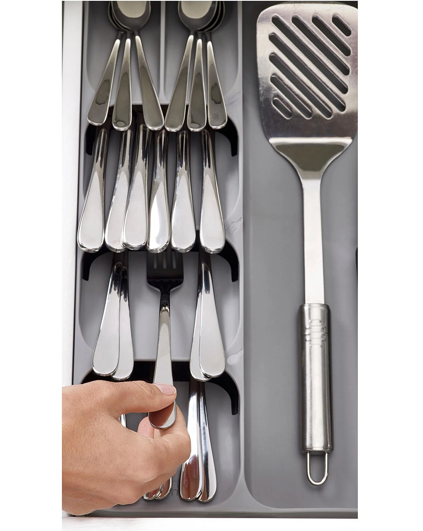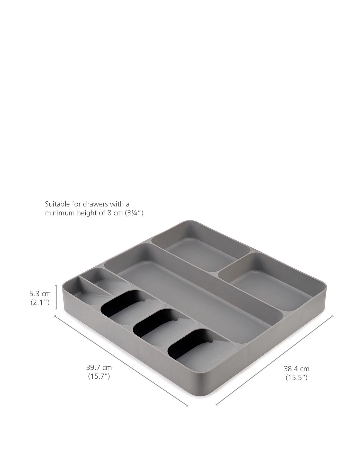 Organise messy utensil and cutlery drawers with this practical and smart storage solution. This unique tray combines five overlapping compartments for storing cutlery with three deep-sided compartments for holding utensils and gadgets. What’s usually stored in two drawers can now be neatly organised into one, creating more space in your kitchen.