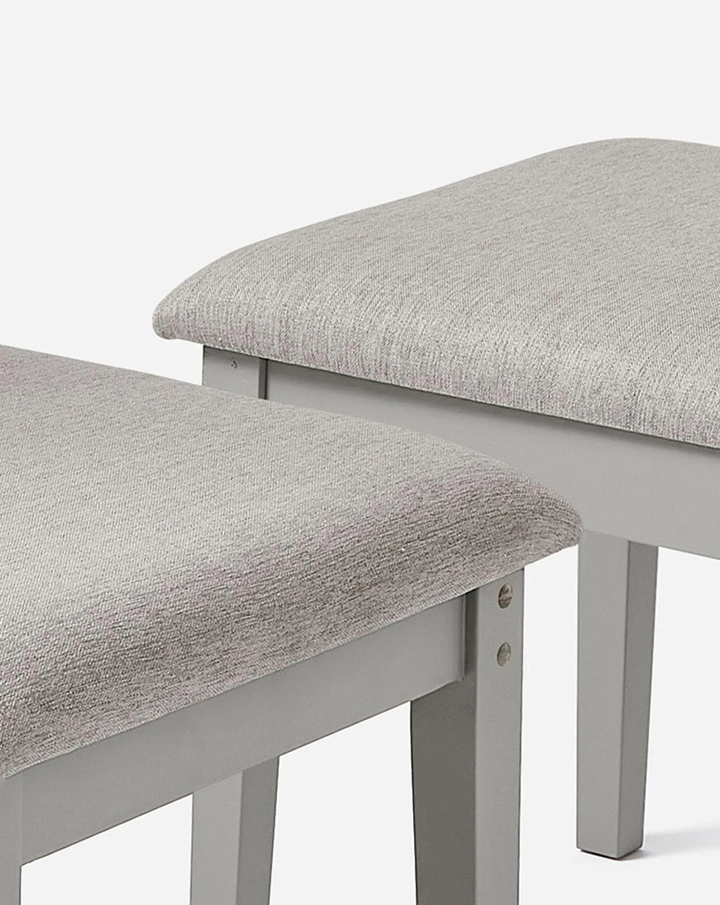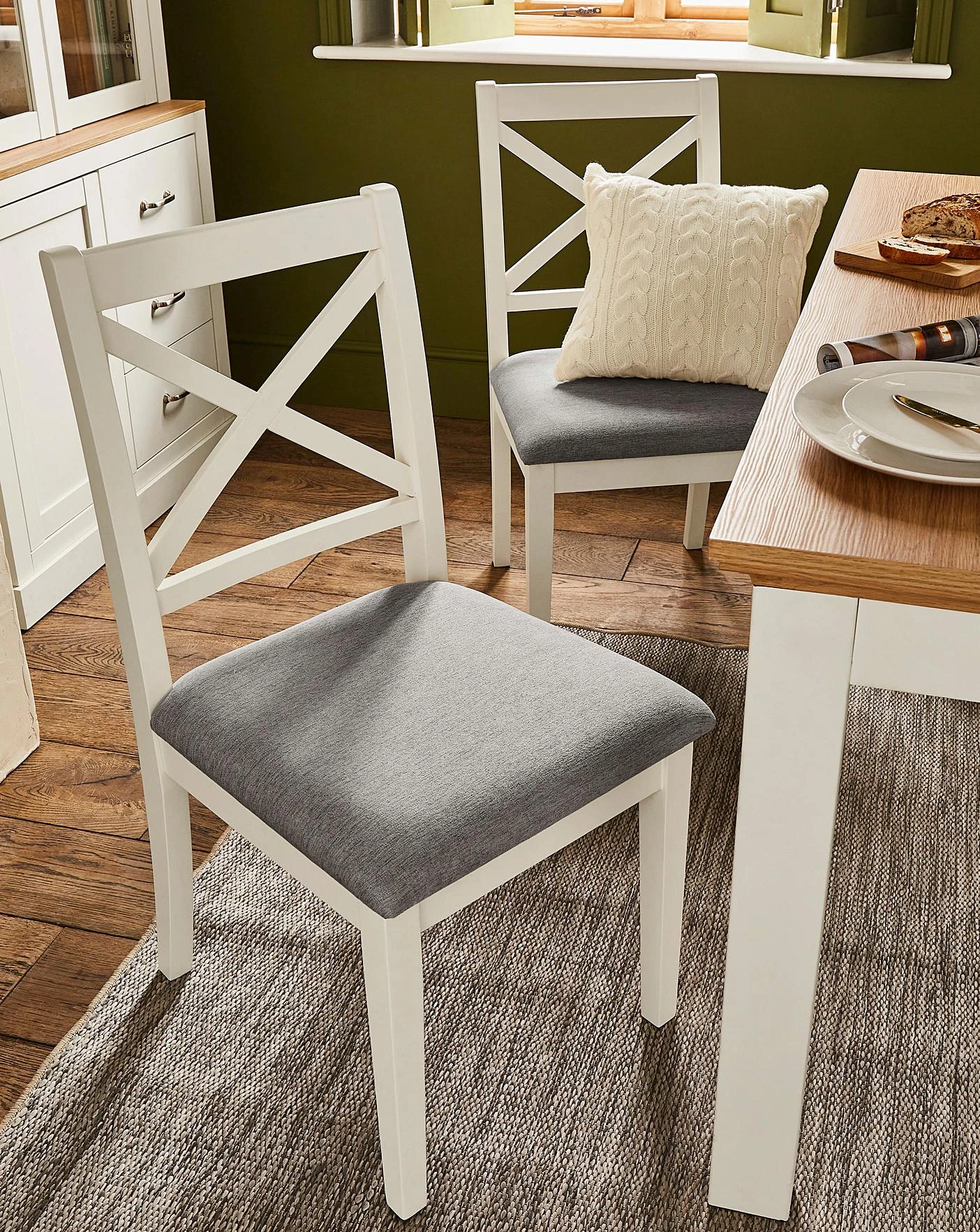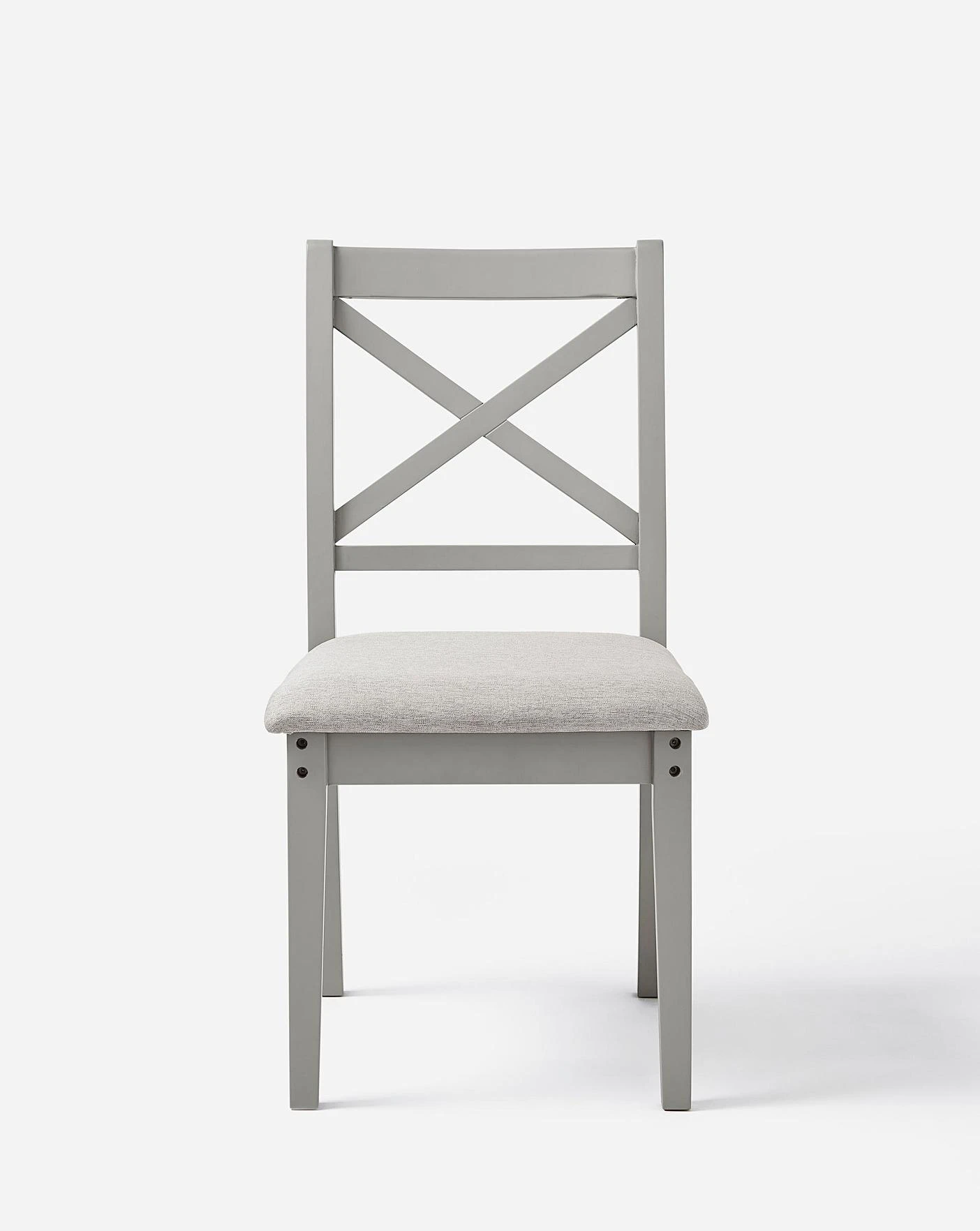 Part of the Julipa brand, the Ashford dining chair is a wood effect material painted in neutral colours. The seat is a foam seat with a fabric cover. Comes as a set of 2.