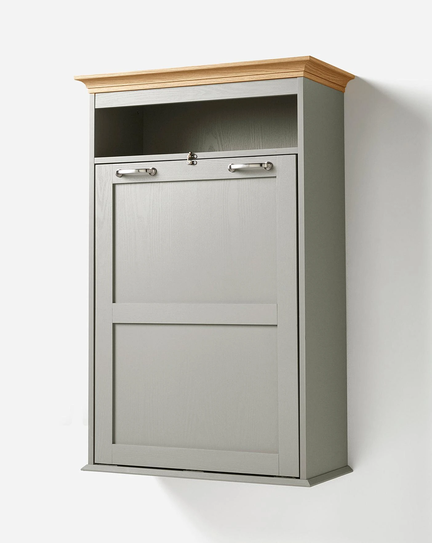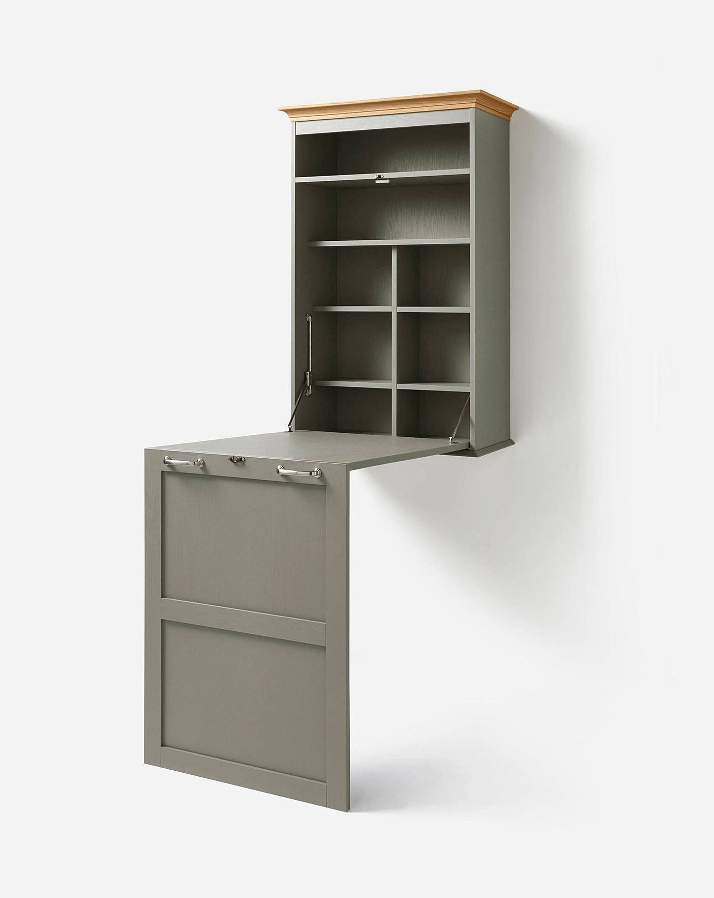 Part of the Julipa Brand, the wall mounted table is designed to be folded away for space saving. Consisting of 4 integral shelves and fold away table top, the table features a chunky, solid wood plinth.