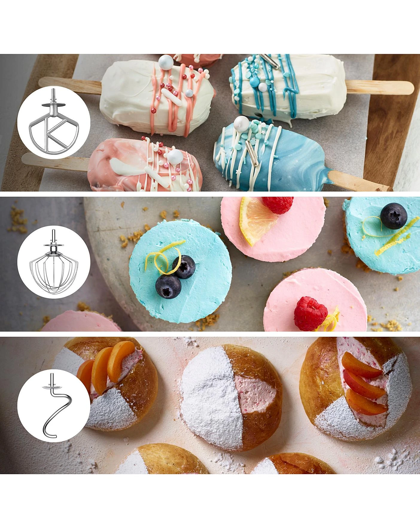 Contemporary stylish design with no compromise on performance. Mix, whisk, knead and fold with ease. Includes large feed tube for ease of adding ingredients whilst the machine is mixing. The innovative fold function helps to fold and layer ingredients together, exceptionally good for preparing souffles. Carefully and smoothly build up speed without causing the spillage of ingredients, particularly when mixing in flour. For increased safety the kMix automatically stops when the head is lifted to prevent accidental operation.
