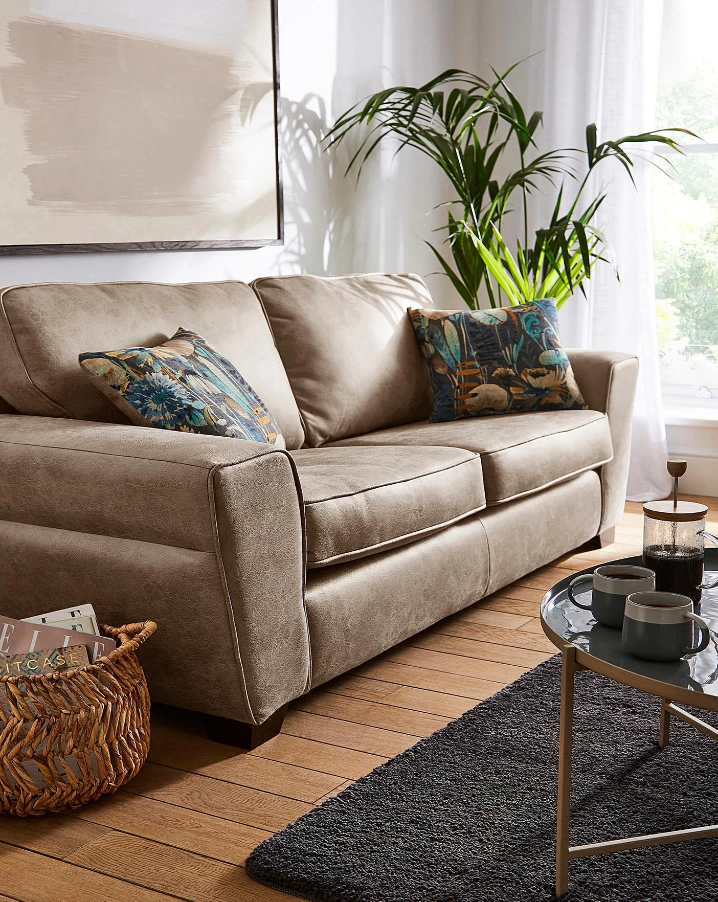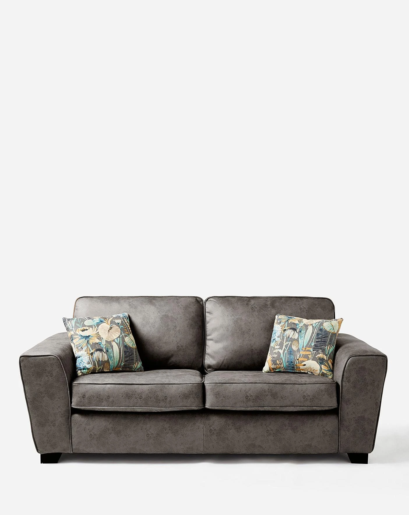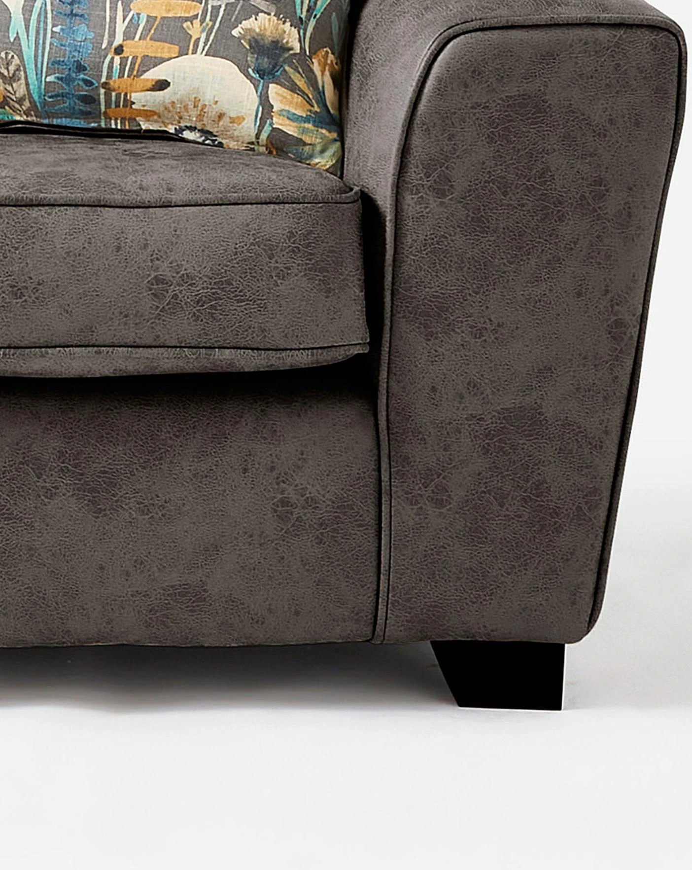 The Lennox 3 Seater Sofa is composed of a 100% polyester faux leather fabric with piping detail on front facings, seat and back cushion. The sofa sits atop wooden legs and includes 2 design cushions, comfortably seating 3 people.