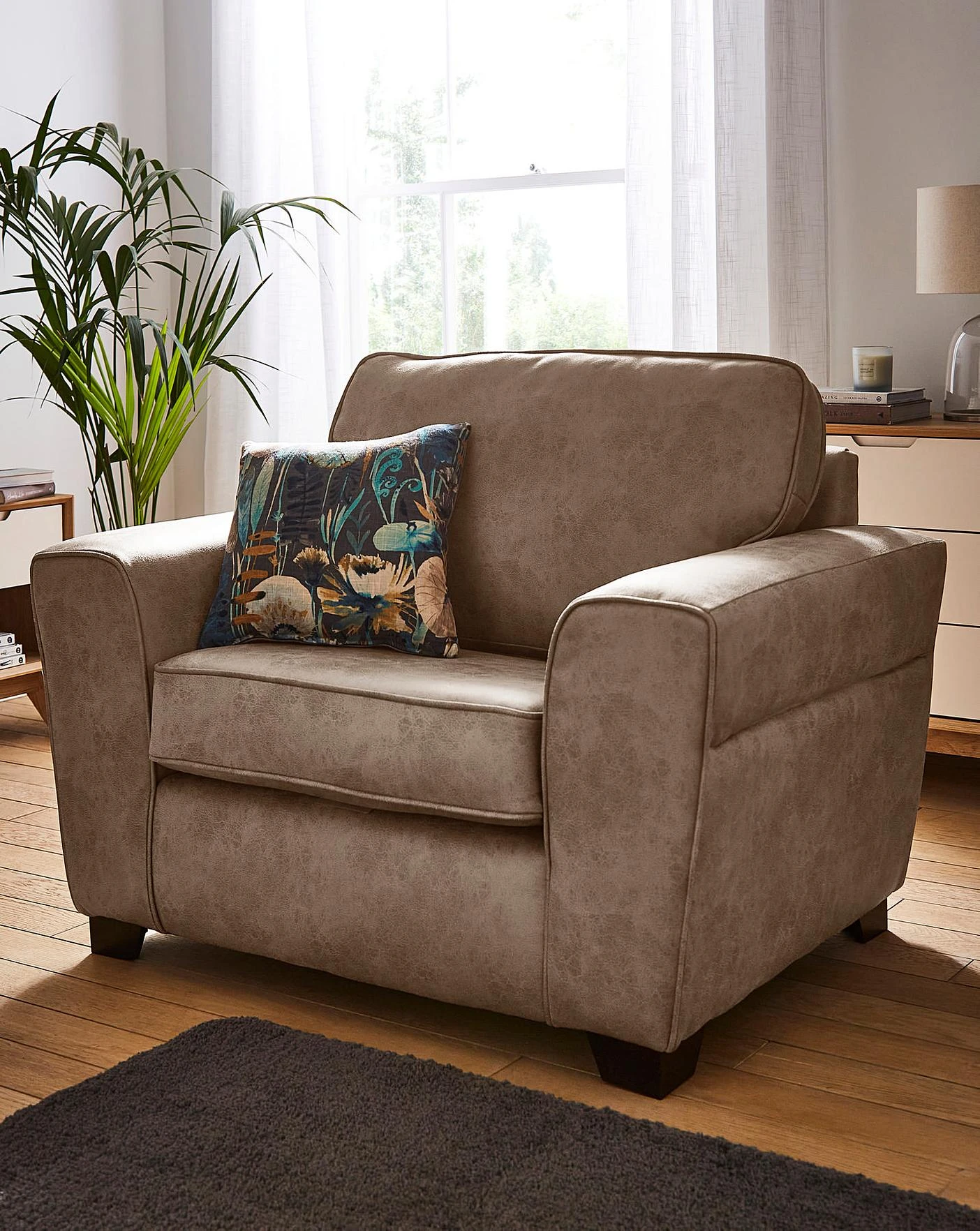 The Lennox Snuggler is composed of a 100% polyester faux leather fabric with piping detail on front facings, seat and back cushion. The sofa sits atop wooden legs and includes a design cushion.