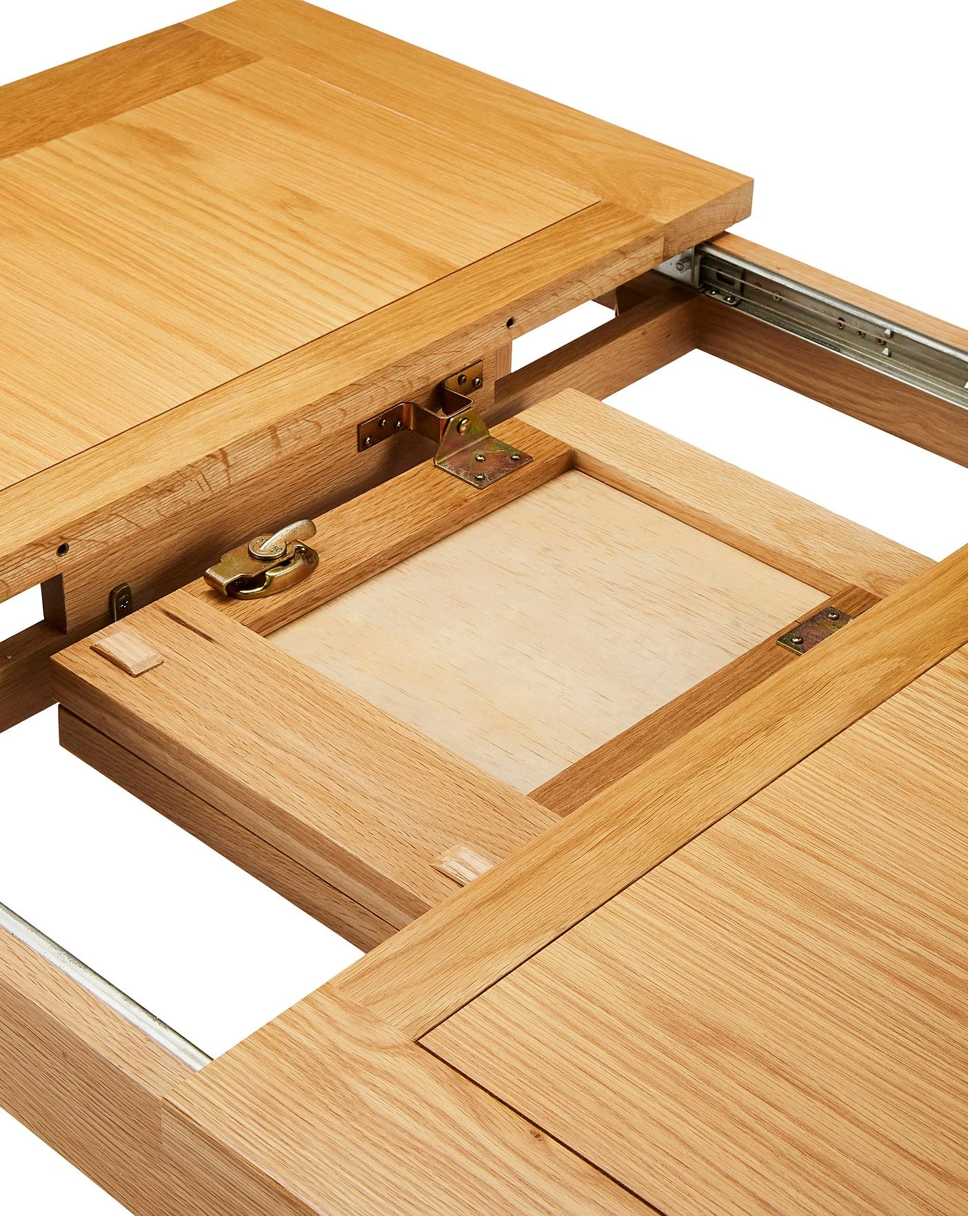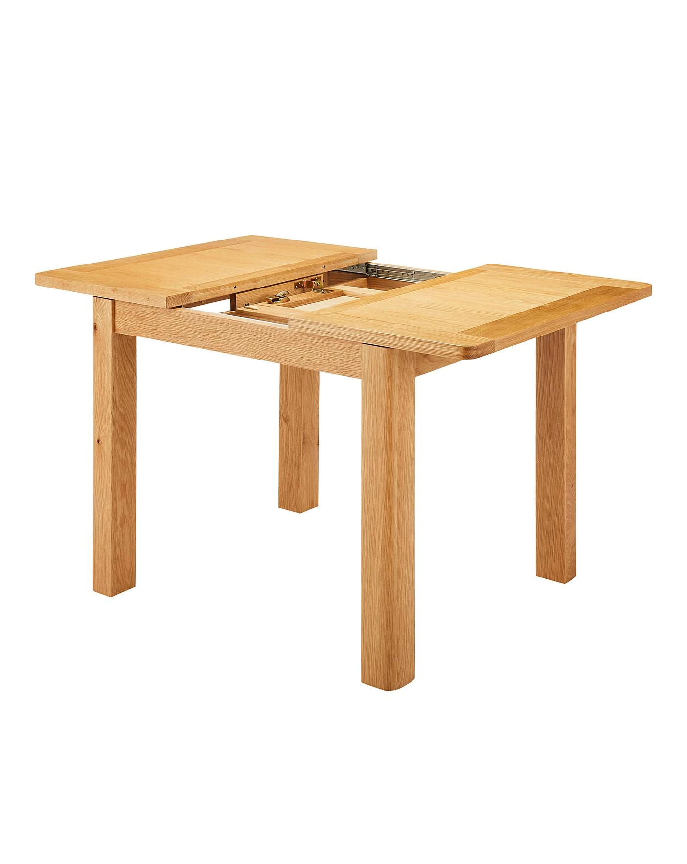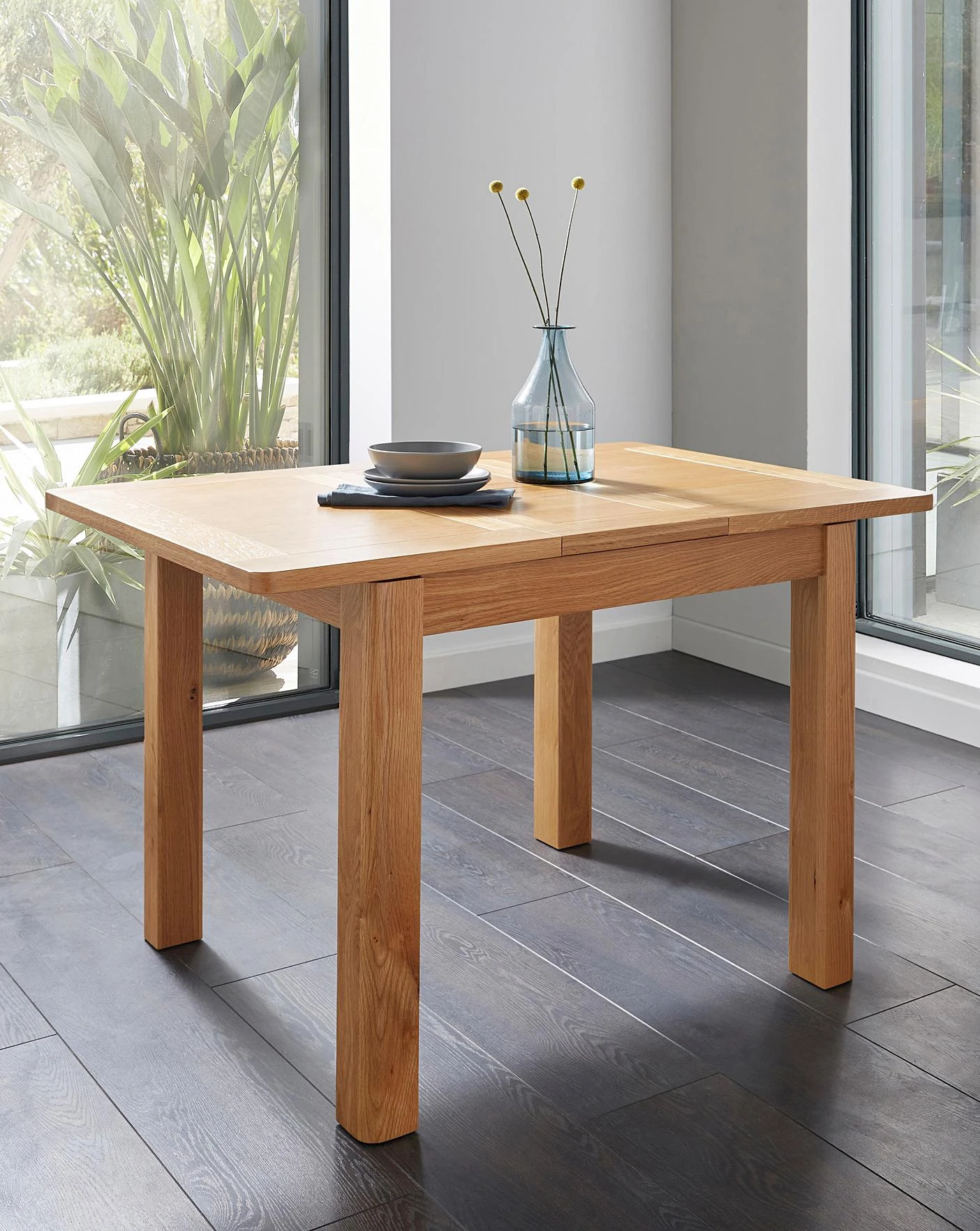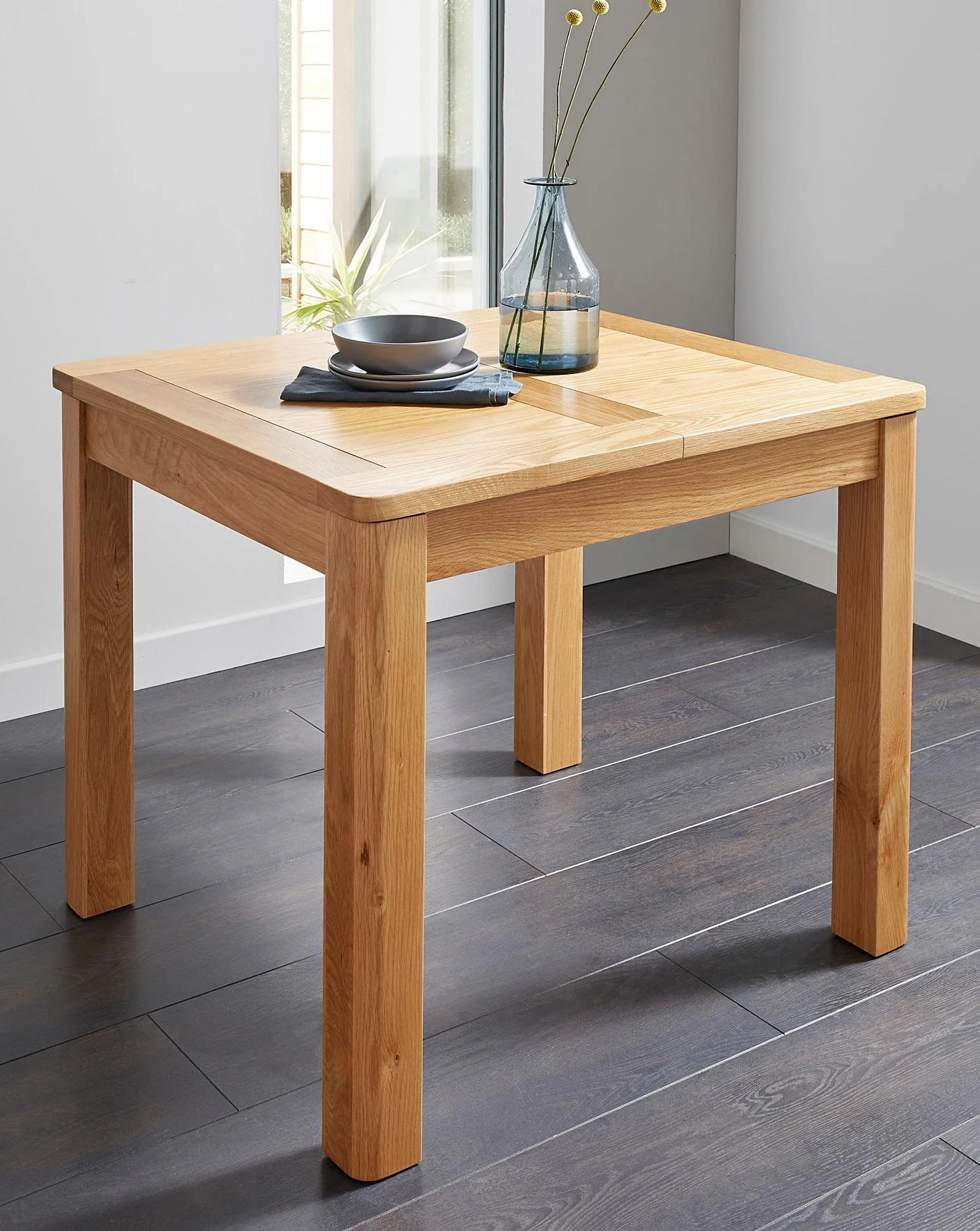 The Logan Oak Small Extending Dining Table is part of the Logan Dining Range, a beautifully finished country inspired oak dining range. Crafted from solid oak and oak veneer tops, these gorgeous solid wood tables will add a contemporary feel to any home, serving as a stunning focal point. With hidden extension leaf, the table can extend from 90cm to 120cm, ideal to accomadate extra guests. Complements the Logan Oak Living Range perfectly.