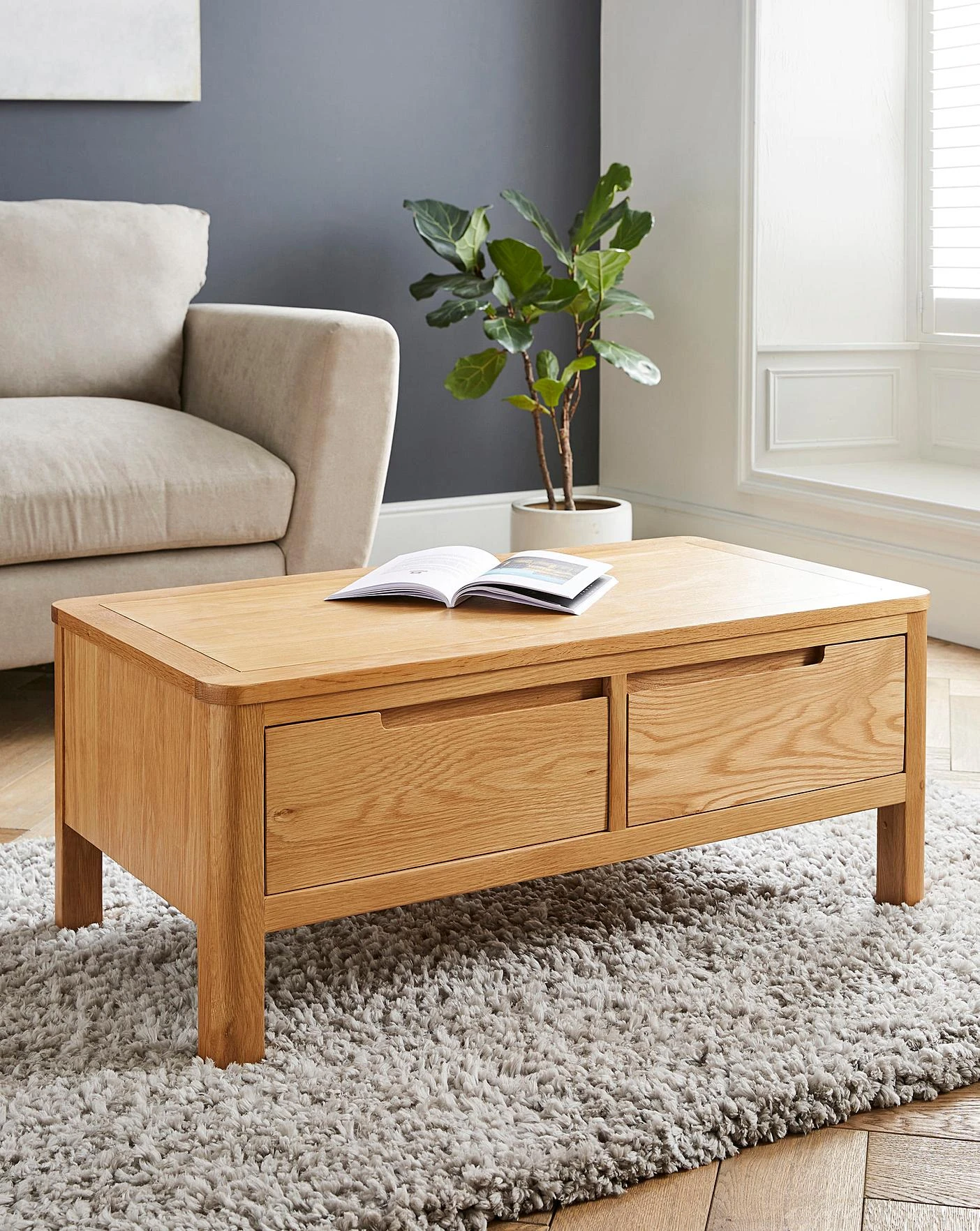 The Logan Oak range, crafted from solid oak, is perfect for modern family homes. Characterised by its curved corners and recessed handles, this range is perfect for adding a retro theme to modern homes. Featuring a soft grey painted finish with oak tops, this Storage Coffee Table is stylish and practical, with drawers for all your additional storage needs.