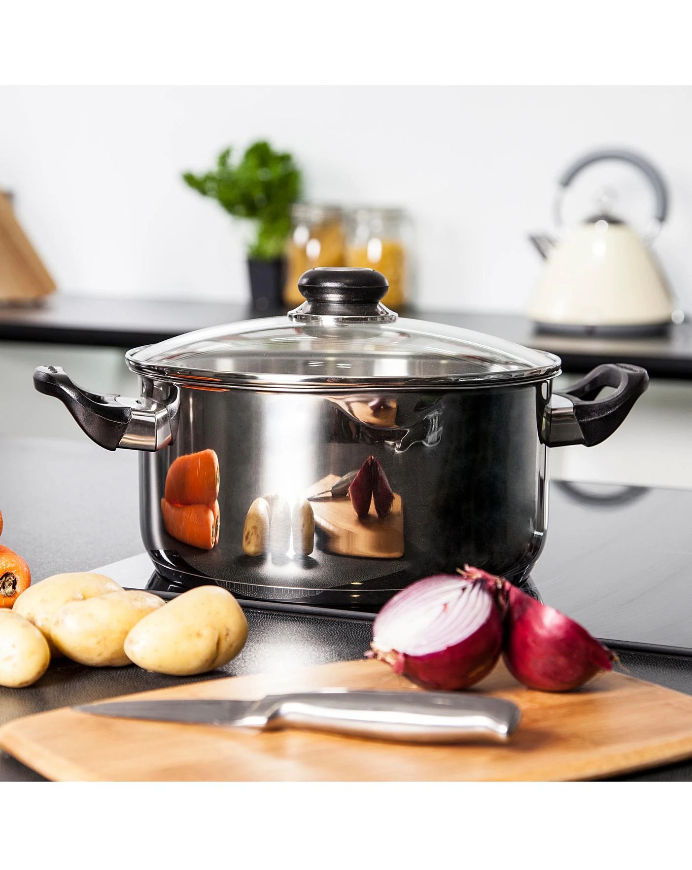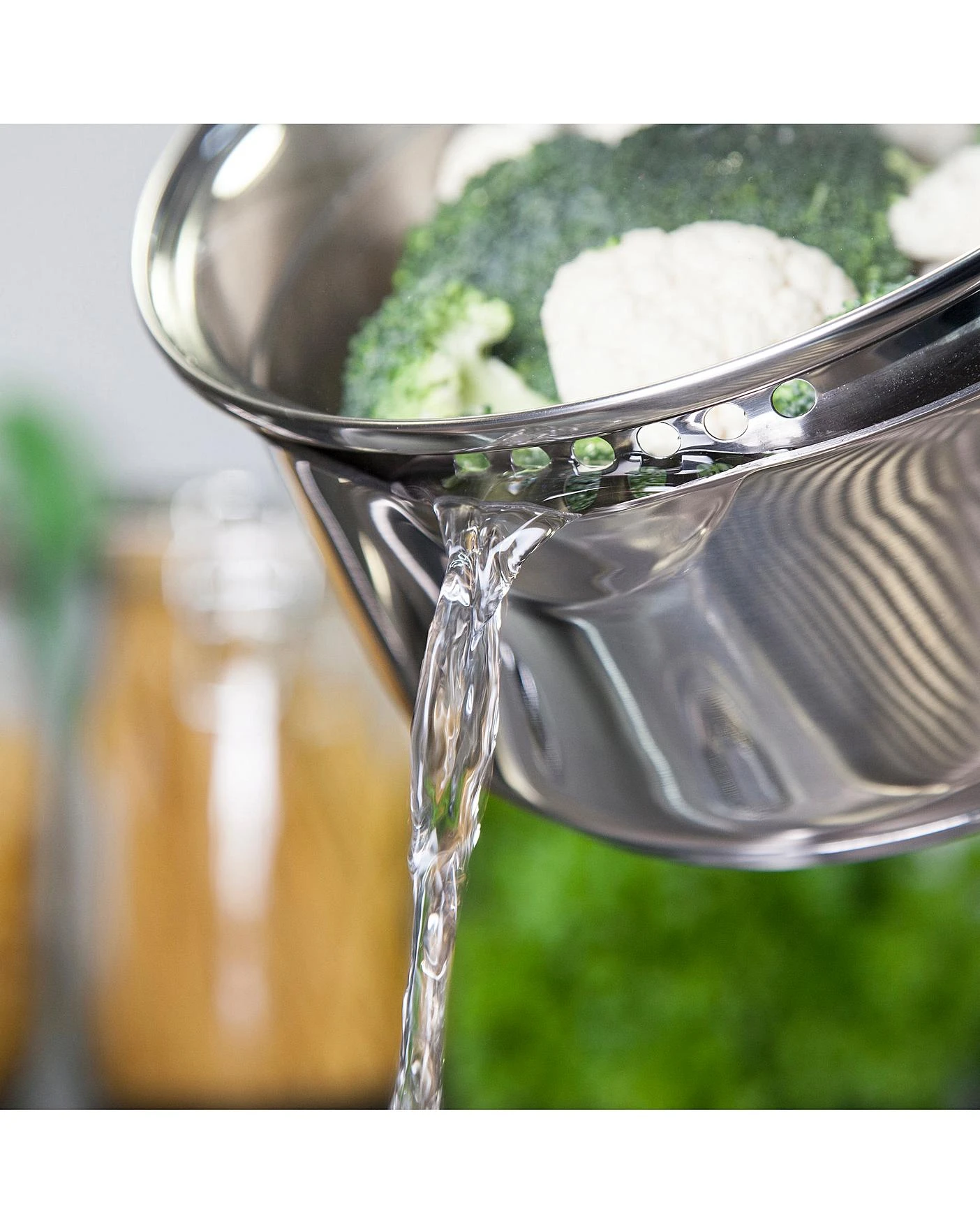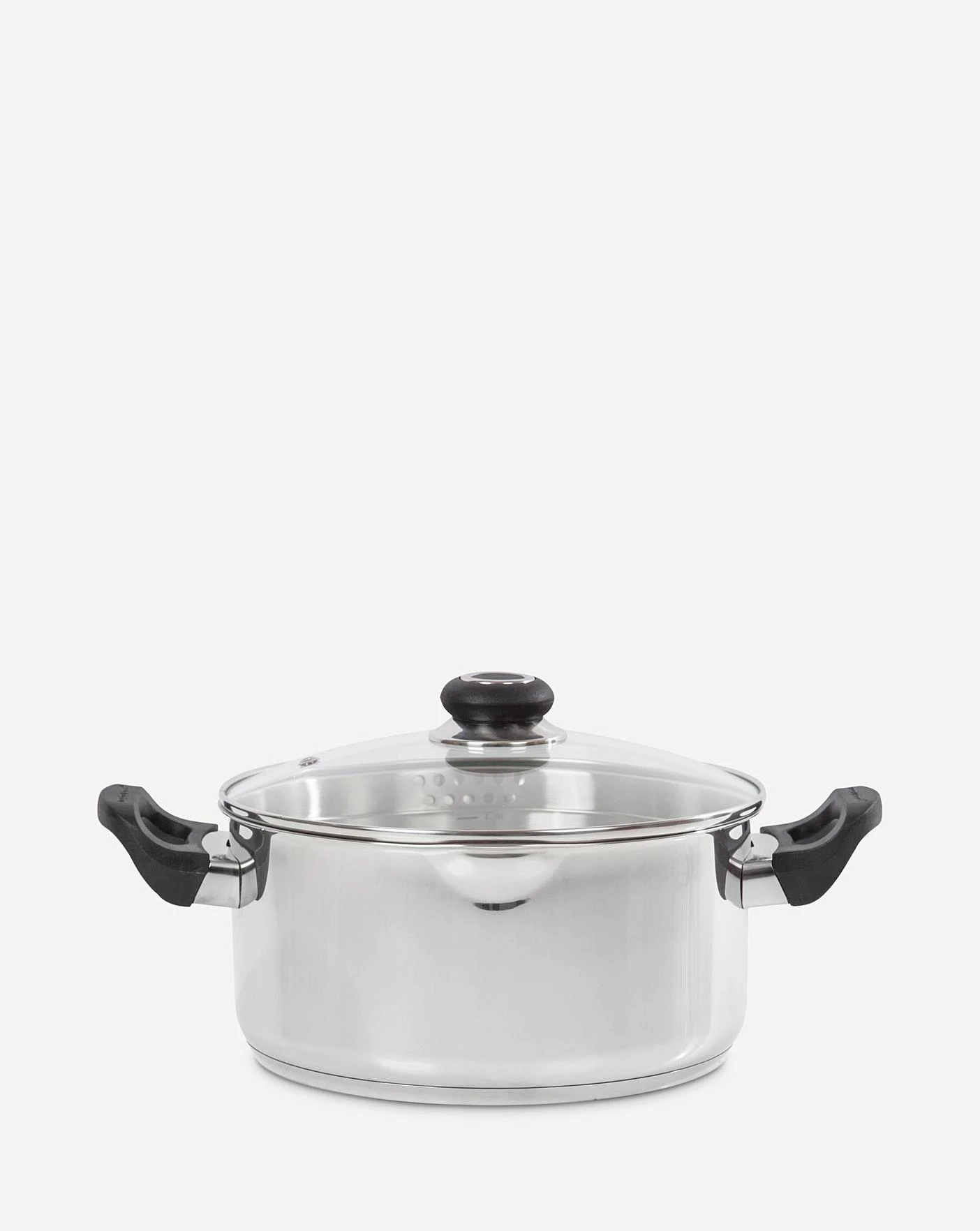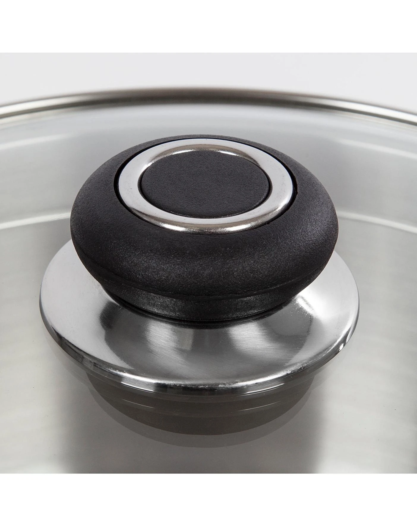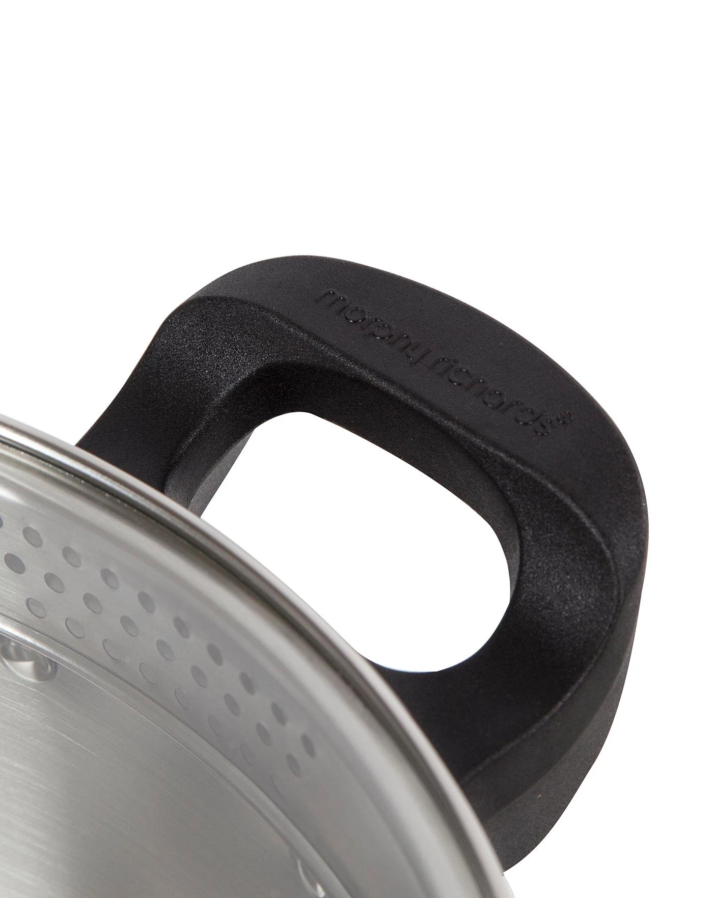 High grade polished stainless steel body,Tempered glass lid and inner capacity markings,Double pouring spouts for easy use left or right handed,Fast and slow straining rim and steam release valve,Riveted phenolic stay cool handles and lid knobs,Thermocore encapsulated stainless steel base,Suitable for all hob types including induction