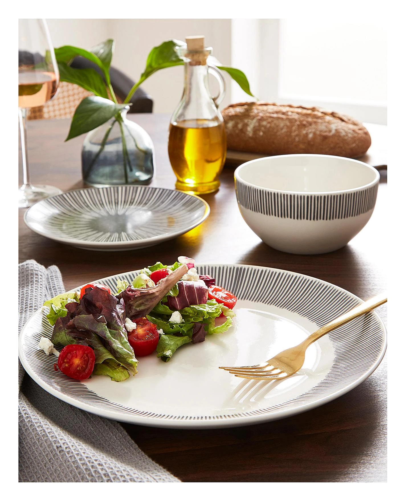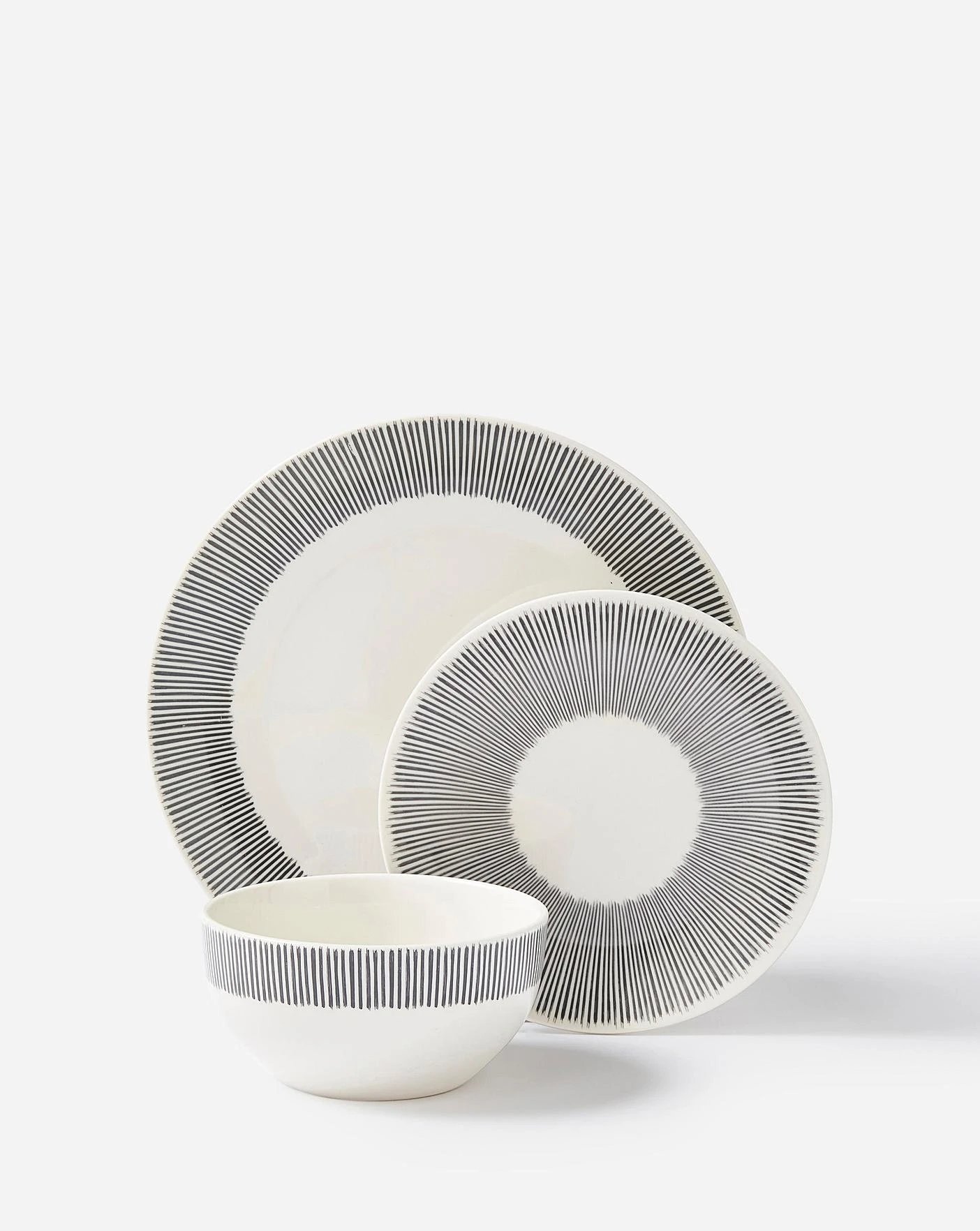 This 12pc dinner set consists of 4 dinner plate, 4 side plates and 4 bowls. Each piece is decorated with a contemporary and striking linier design with a subtle textured finish. Part of a co-ordinating range other items are available. This dinnerware range is made from White porcelain and is dishwasher and microwave safe.