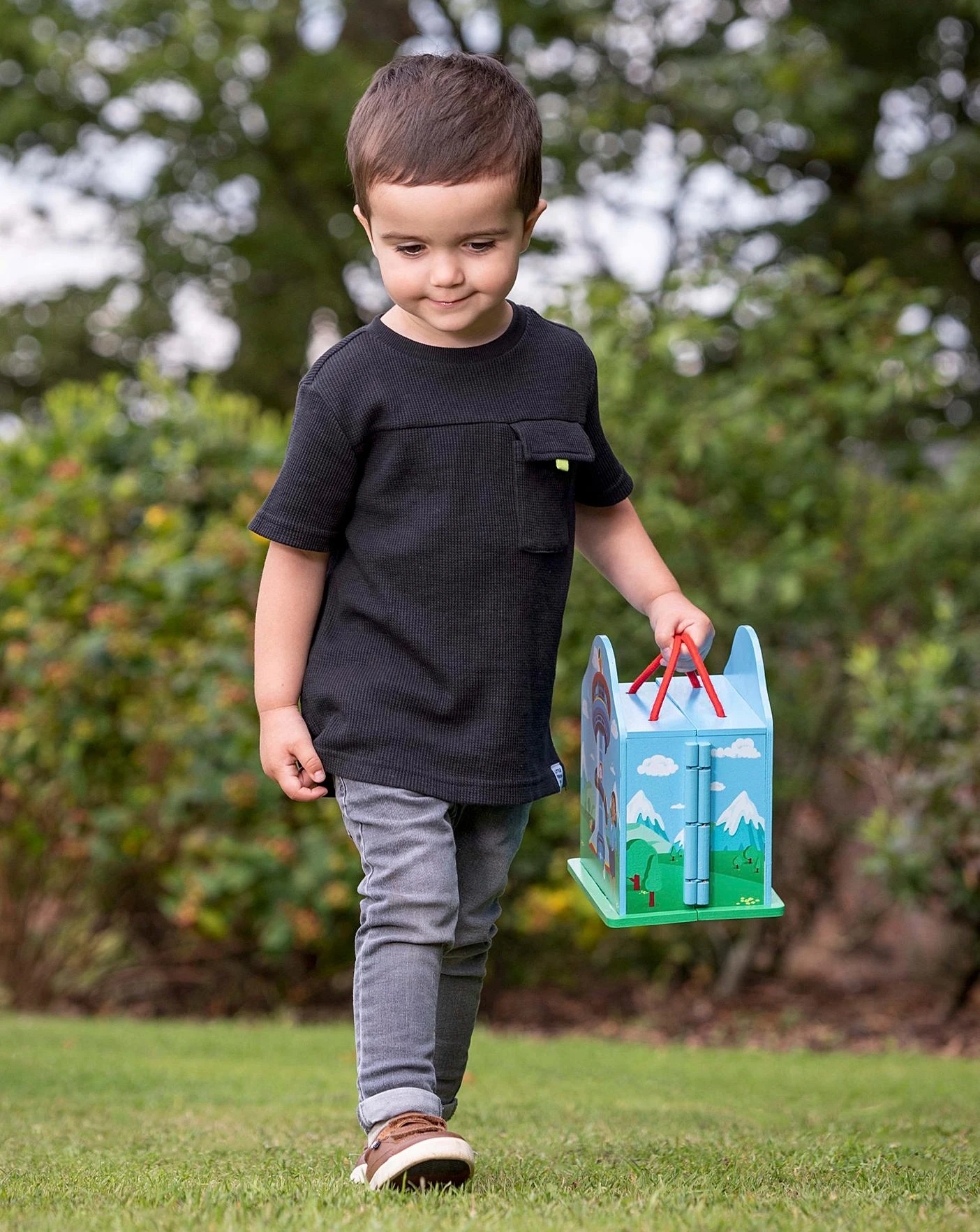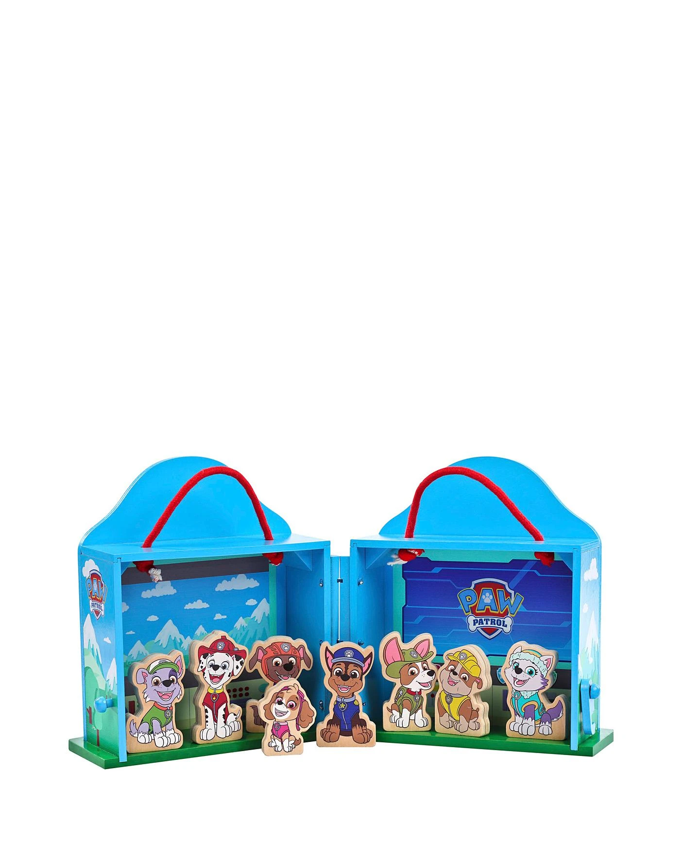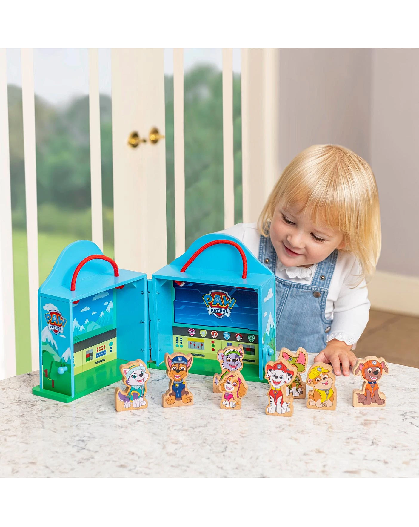 The New Paw Patrol Wooden Carry Along House is part of a charming collection of traditional wooden Paw Patrol toys. Produced with contemporary execution for today’s pre-schoolers. The cleverly designed back hinged house features the Paw Patrol landscape and a carry handle to allow for easy transportation. It opens up to reveal a spacious interior to store everything away tidily after play. The bright and beautifully designed character figures are brilliant for recreating scenes from your favourite episodes or letting their imaginations run wild. All the gang are included, Chase, Marshall, Skye, Rocky, Zuma, Rubble, Everest and Tracker. Encourages imaginative play.