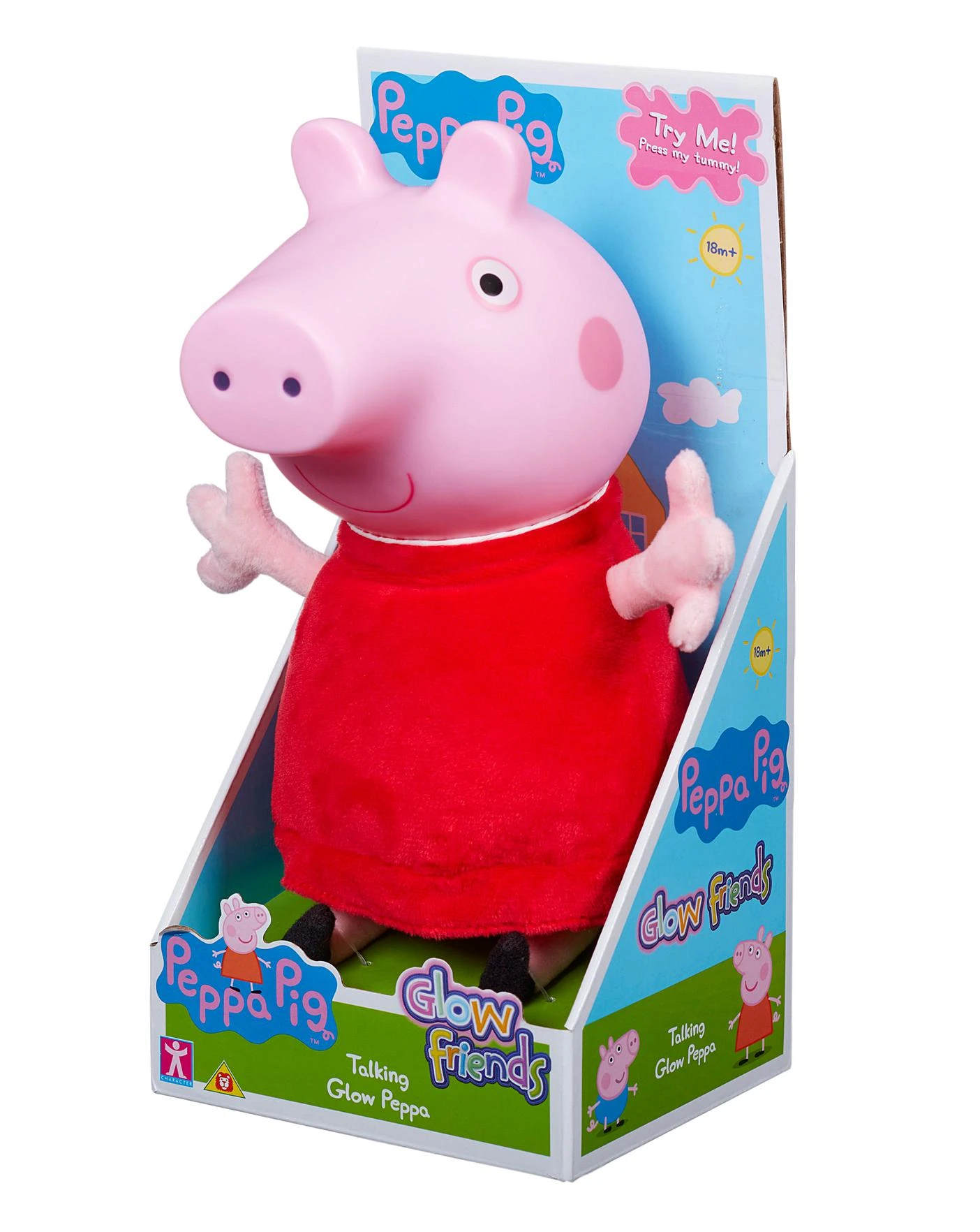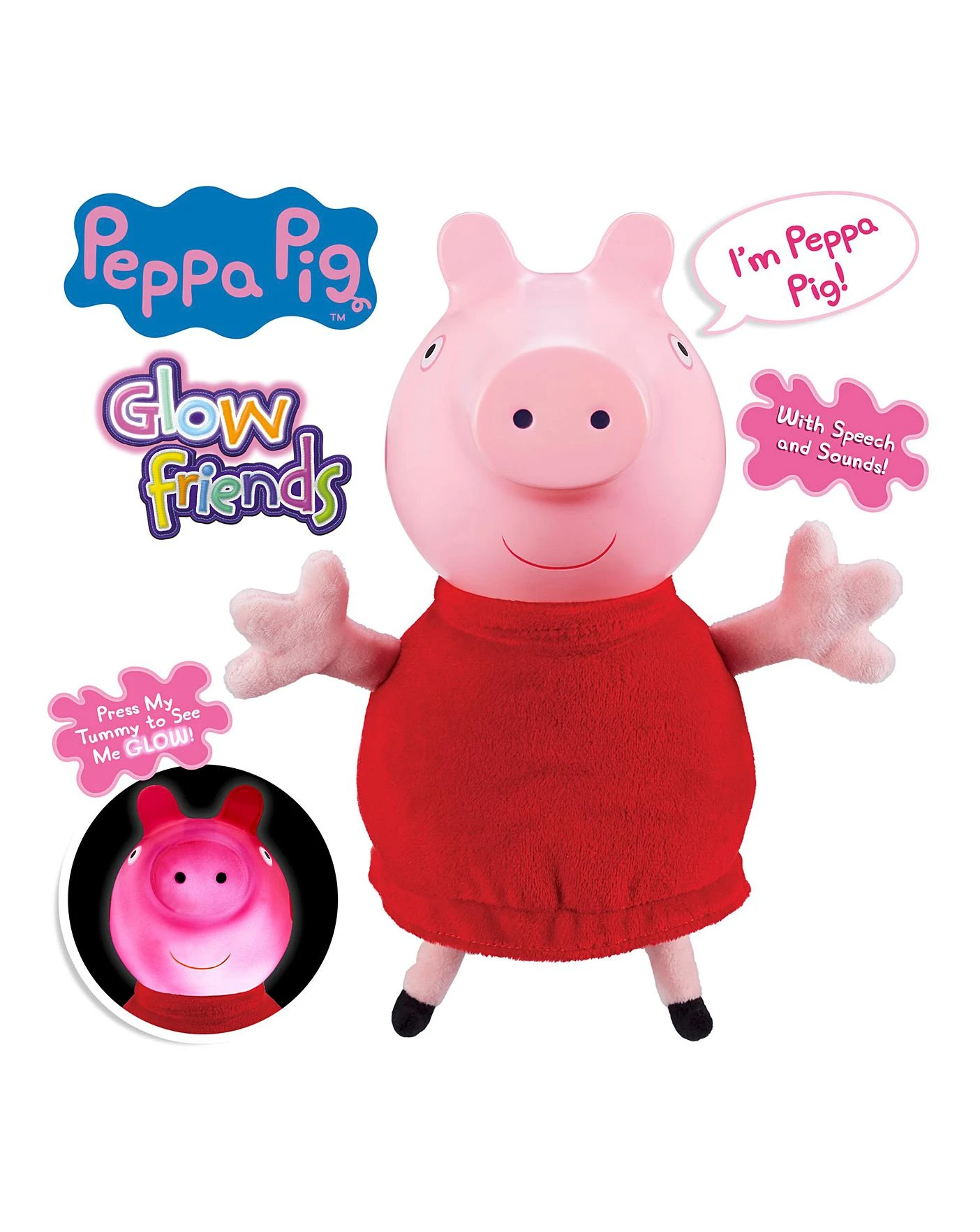 Large Peppa Pig Glow Friend! The perfect bedtime friend! Press Peppa’s tummy to see her face light up and to hear her talk! Supersoft and cuddly toy. Says classic Peppa Pig phrases. Measures 22cm tall.