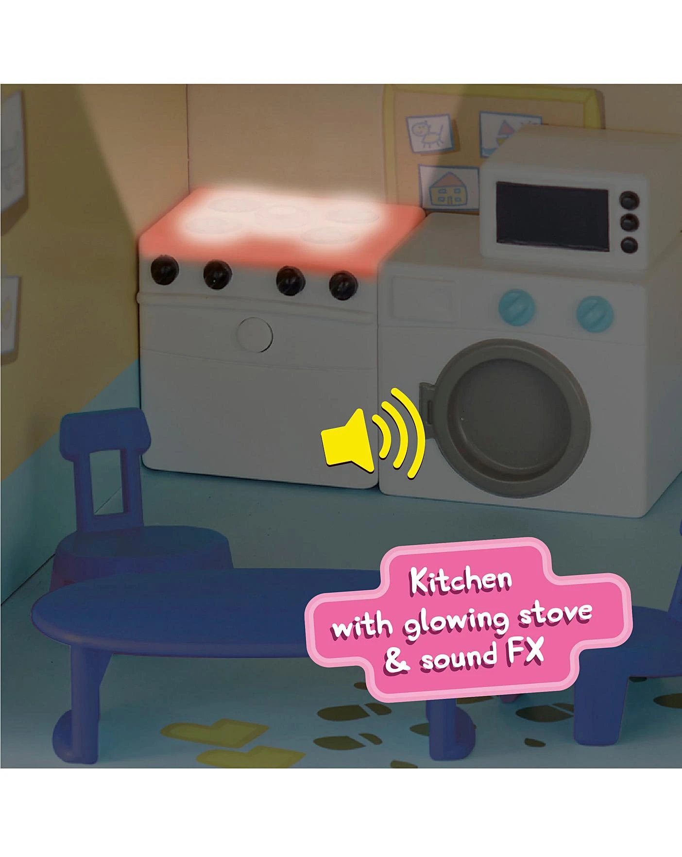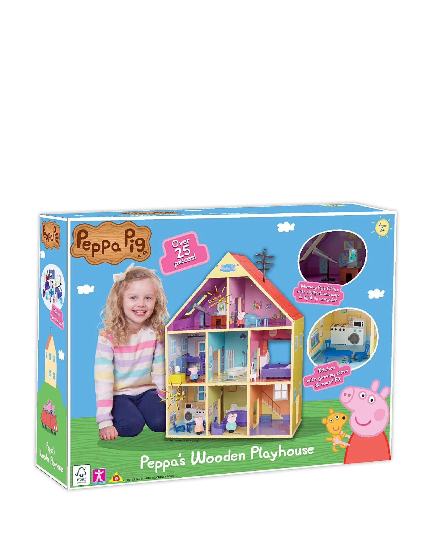 Bring the world of Peppa Pig to life at home with this beautiful wooden house! Standing at 65cm high and 50cm wide, there’s lots of space for the whole family! Made from environmentally responsible FSC certified wood, (license C156989). There are 8 different rooms to explore, each with fun features, furniture and accessories, such as the Living room with sofa and phone holder to create a real TV (Phone not included)! There’s a Kitchen with lights and sounds cooker, bathroom, and Mummy and Daddy Pig’s Bedroom with balcony. In Peppa’s room there are bunk beds, while in the loft is a playroom with a telescope and Mummy Pig’s office where she can play ‘Happy Mrs Chicken’ all day on her computer!