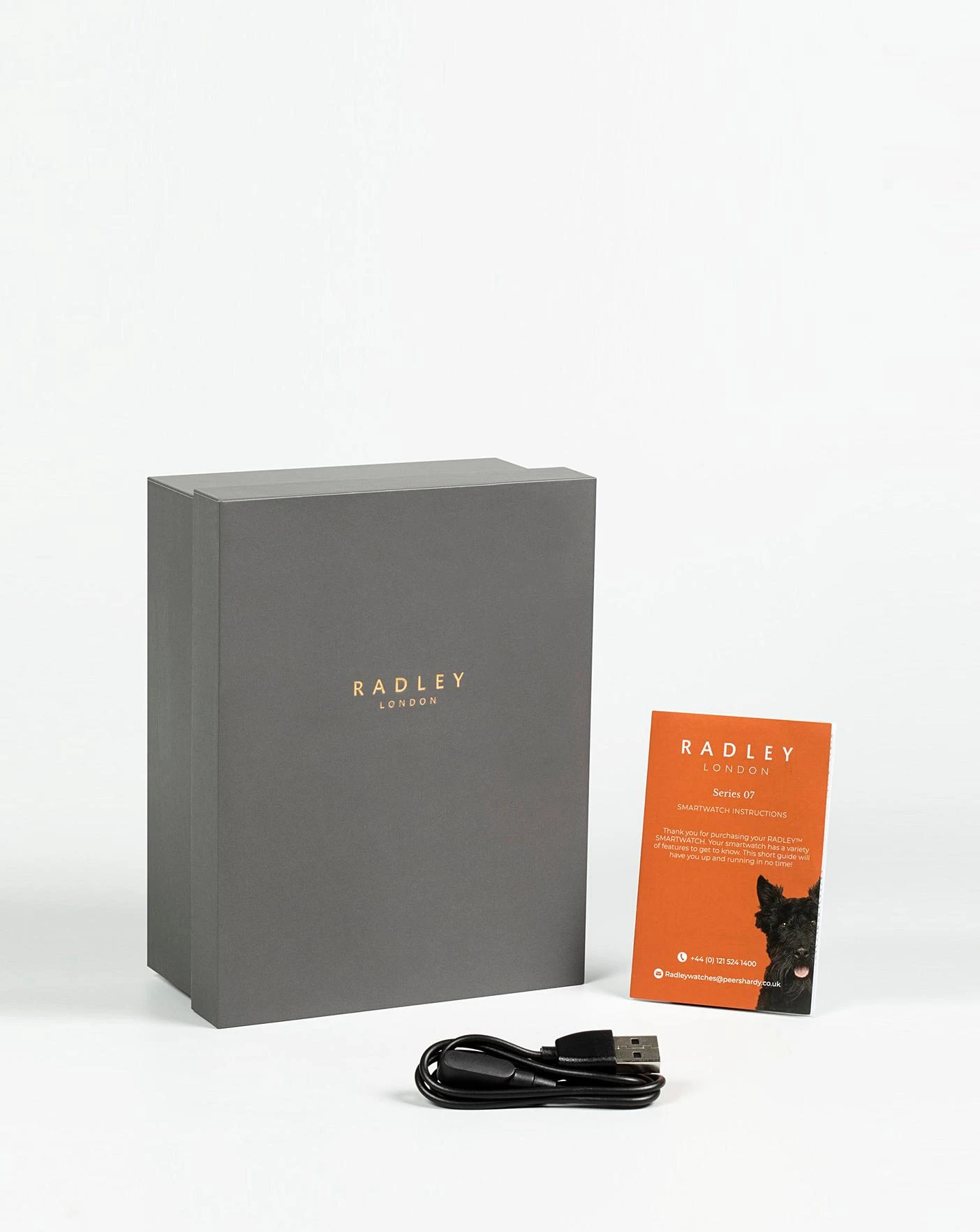 In the box: Watch, 2 Interchangeable Straps, Radley Gift Box, USB Charger.