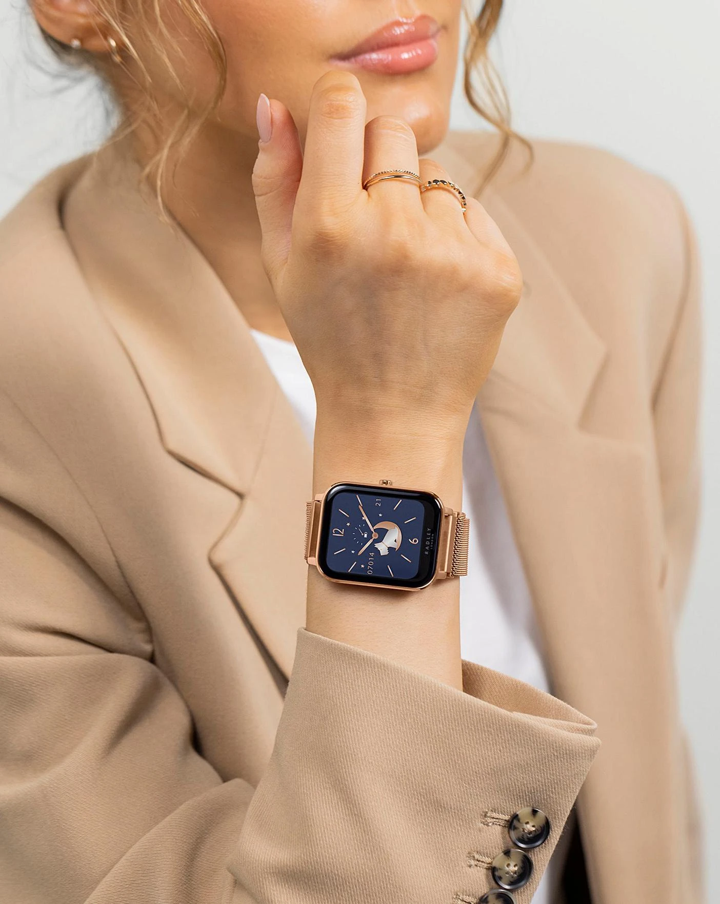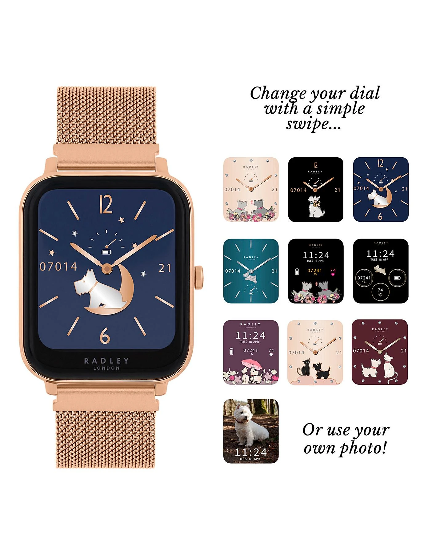 Introducing the Radley London Series 11 smart watch. A stylish square Case with a Polished Rose Gold Case with interchangeable Rose Gold Mesh and Vintage Blue Silicone strap designs. Features include: multiple dial designs with a choice of more than 12 faces, a Bluetooth range of 10 metres, call and message notifications, step counter, track specific activities such as running/walking/hiking/cycling/gym, live weather updates, selfie camera control, calorie counter, phone/watch locator, music control, sleep tracker, heart rate monitor, GPS connection, health reminders for hydration/sedentary/breathing, all on a colour screen, and up to 7 day battery life. Each watch is packed in a Radley London presentation gift box complete with instruction manual, USB charger and 2 year manufacturer guarantee. IP68 water resistance. Download the free Radley London Active App now to explore in more detail. IOS & Android Compatible.
