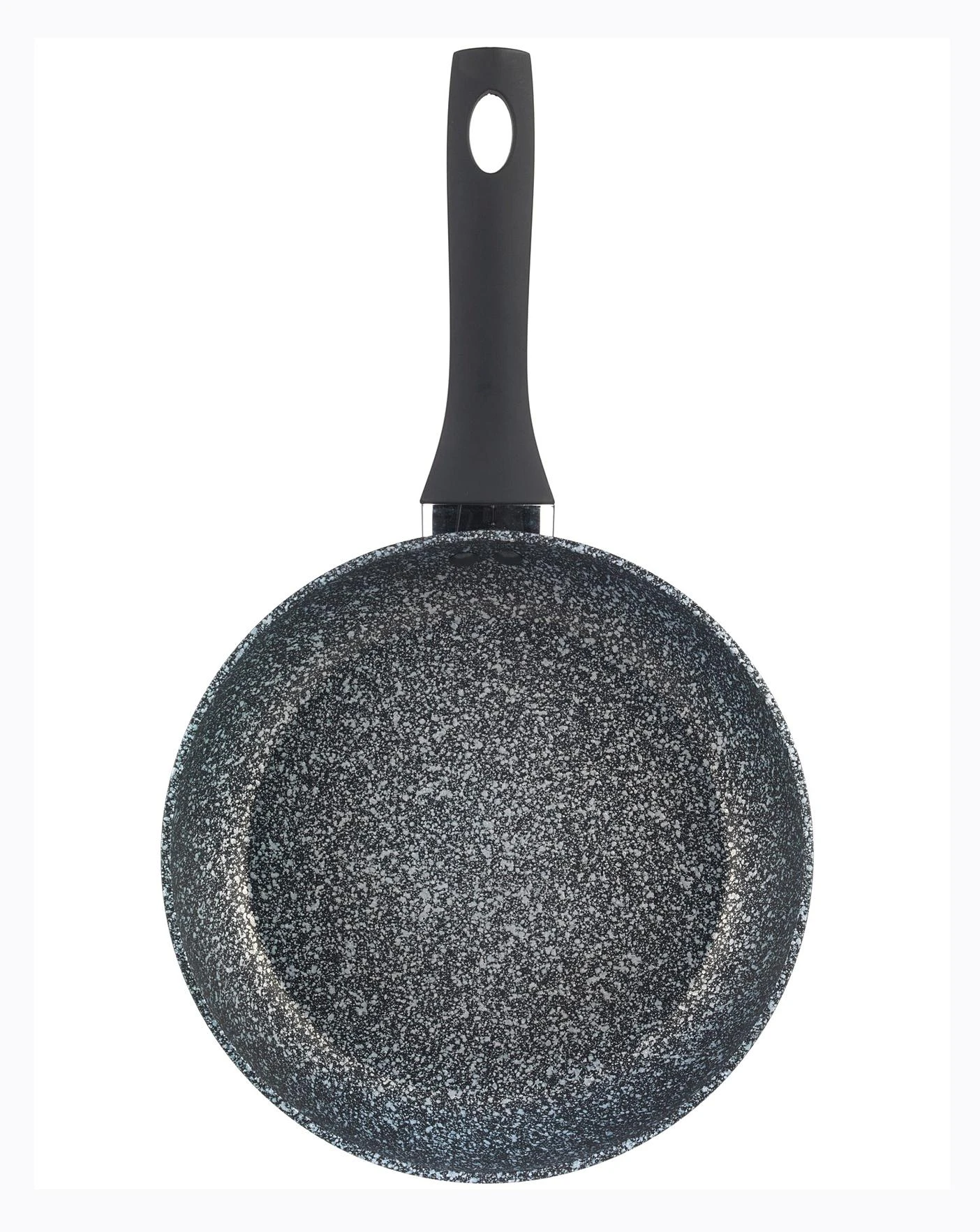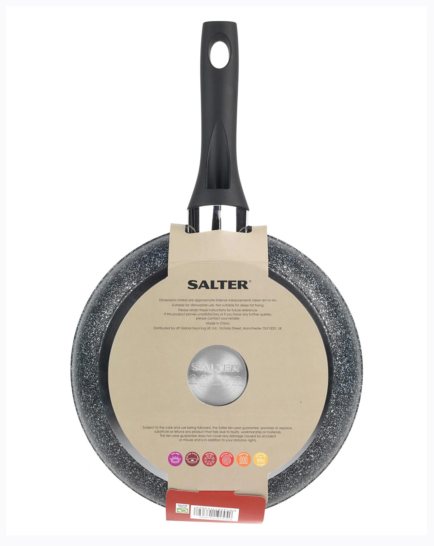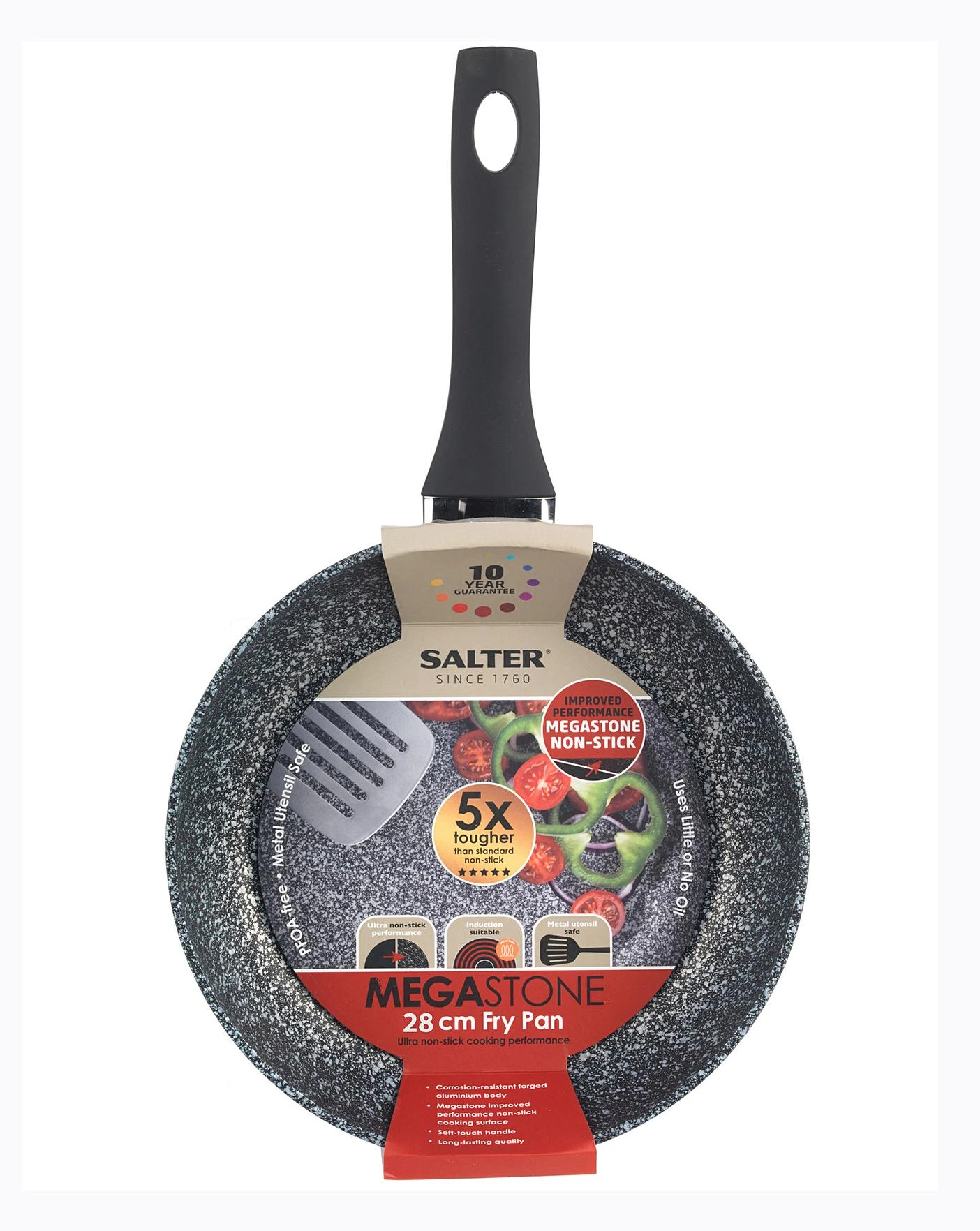 Featuring a unique cooking surface made from a high performance hard stone coating, this Salter Megastone frying pan is five times tougher than standard non-stick cookware so that you can prepare healthier meals using little or no oil when tested against a leading UK homewares retailer own brand non-stick pan. Crafted from four layers of PFOA free materials for long-lasting quality with abrasion, scratch and corrosion resistance as well as an ultra non-stick top coat, the pan can be used with metal utensils. The pan is made from strong forged aluminium with a smart looking black rough textured finish.