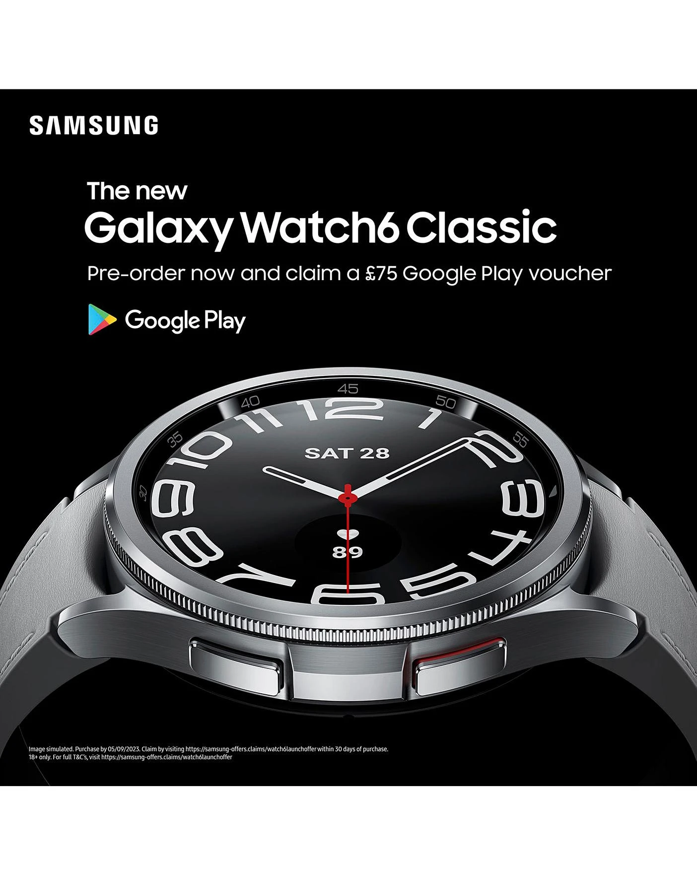 Make the most of every second with the most powerful and stylish Samsung Galaxy Watch yet. Everything on display: See more of your workout, messages, and more. Classic design: Timelessly stylish and packed with the features you need. Sleep: Better nights lead to better days with advanced sleep tools. Everyday wellness: Packed with features to help improve your wellbeing. Seamless Connectivity: Sync with your Galaxy phone for a truly connected experience. Battery & performance: Be always on with a long lasting battery and smooth performance. Your go-to apps, tunes and podcasts are always at hand, thanks to 16GB of storage. Need a smartwatch that can keep up with you? The Watch6 series features Samsung’s fastest watch processor yet – making accessing content smooth and fast. While 2GB of memory means moving between apps is a breeze.