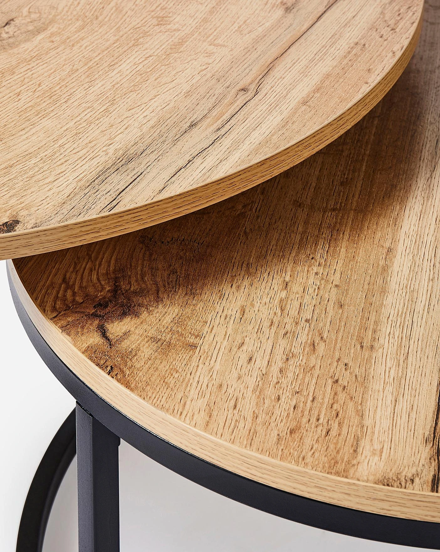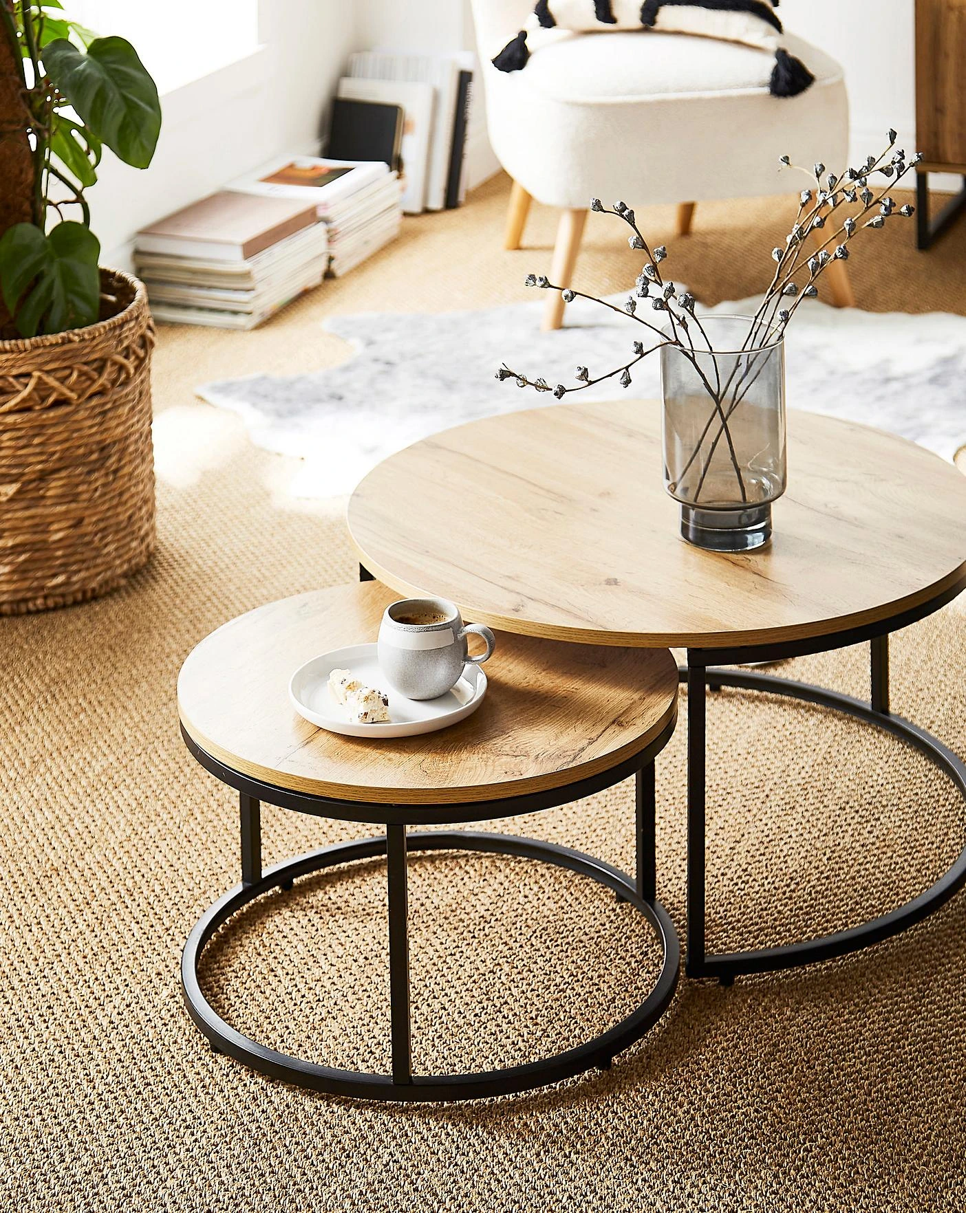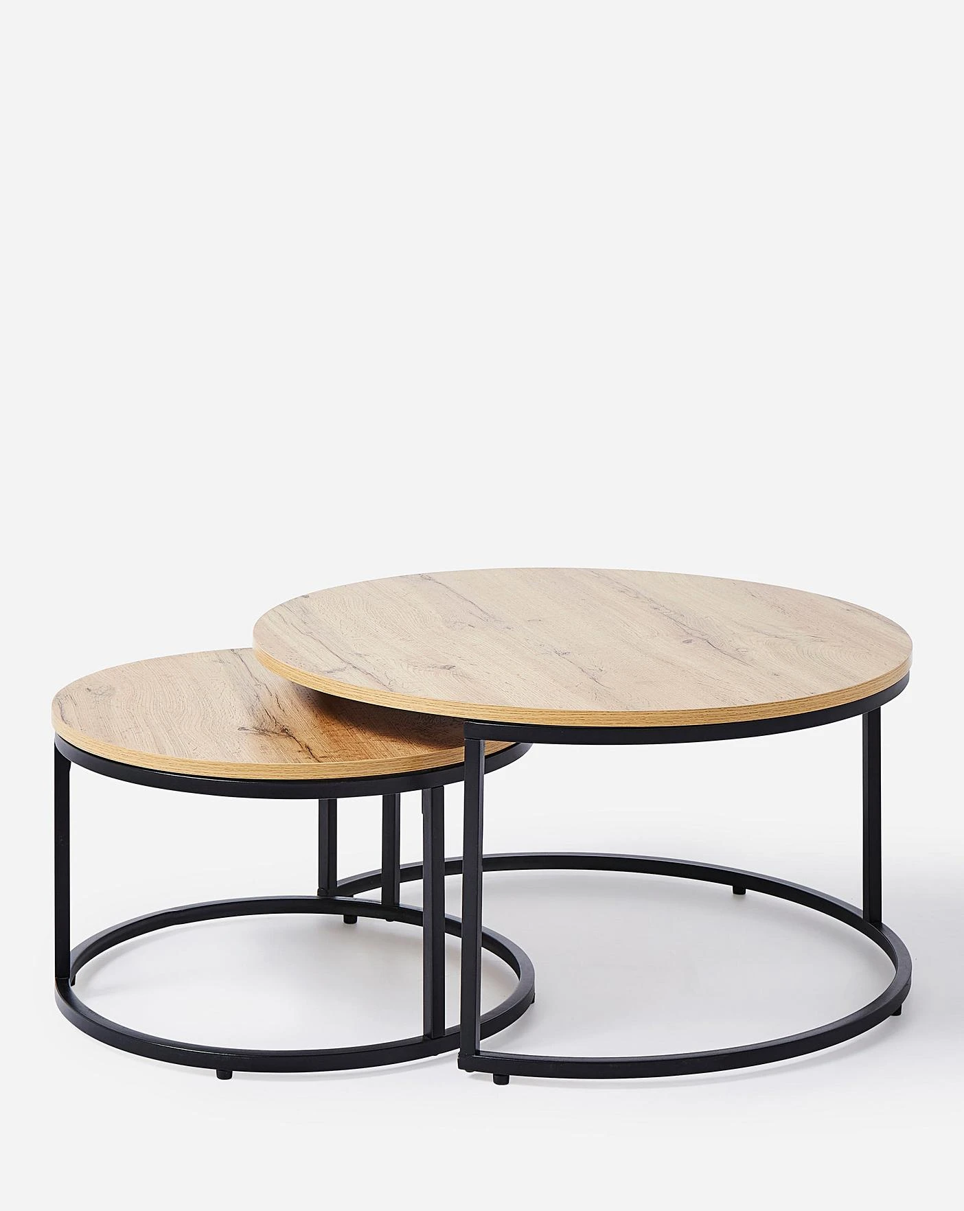 The Shoreditch Range is a contemporary and minimalist design, perfectly suited to any home decor styles. Made from durable materials, this range has a rustic oak-effect finish and complementing black legs. This Nest of two Coffee Tables provides a simplistic yet functioning design, which allows you to style them seperatley or together.