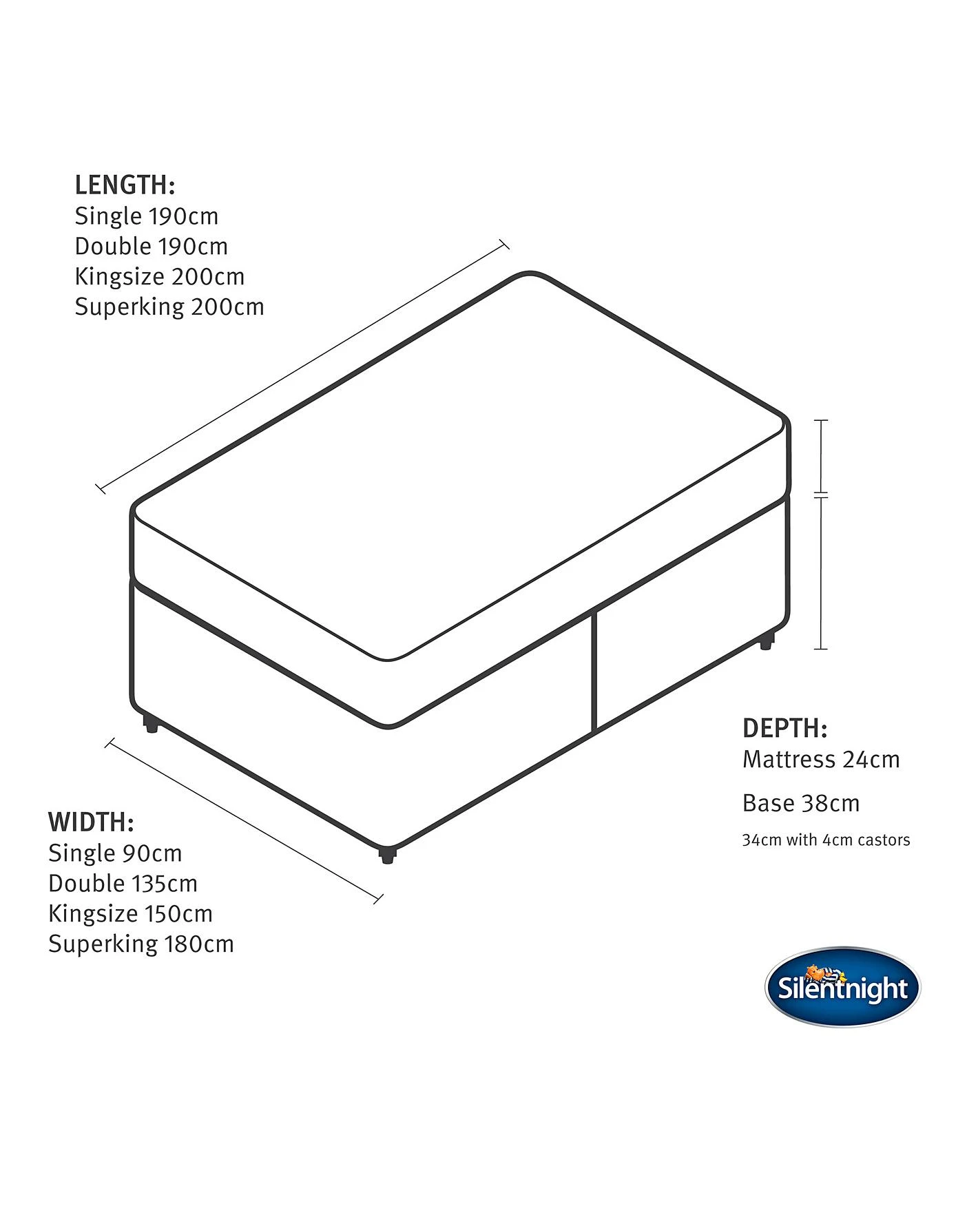 Single measures W.90 x L.190cm approx. Double measures W.135 x L.190cm approx. Kingsize measures W.150 x L.200cm approx. Super King W.180 x L.200cm. Mattress depth 24cm. Divan set H.62cm approx.