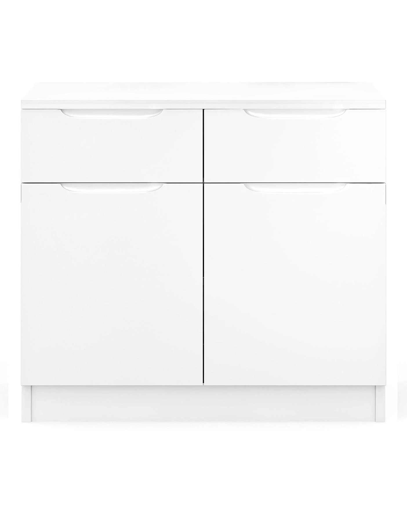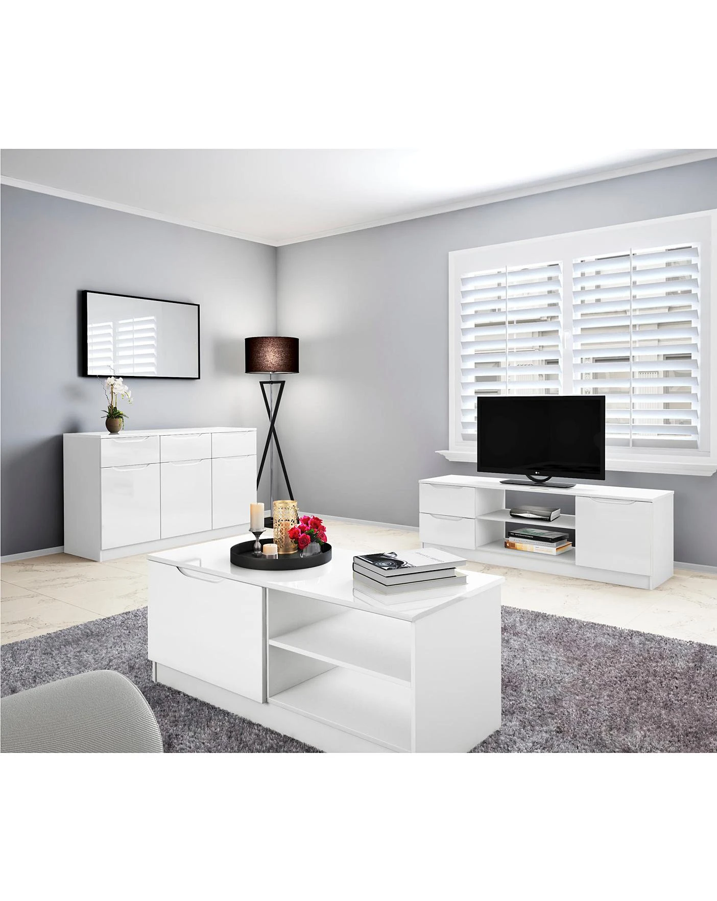 The Sorrento Ready Assembled High Gloss Small Sideboard is part of the stunning Sorrento living range, ideal to sit beautifully in modern and contemporary homes. Characterised by its shiny, high-gloss finish and a handle-free look with inset handles, this range comes with the added benefit of being fully assembled. Features plenty of storage space behind the doors with removable internal shelves, along with two drawers with a heavy duty 8mm base sat on easy-glide metal runners for additional storage.