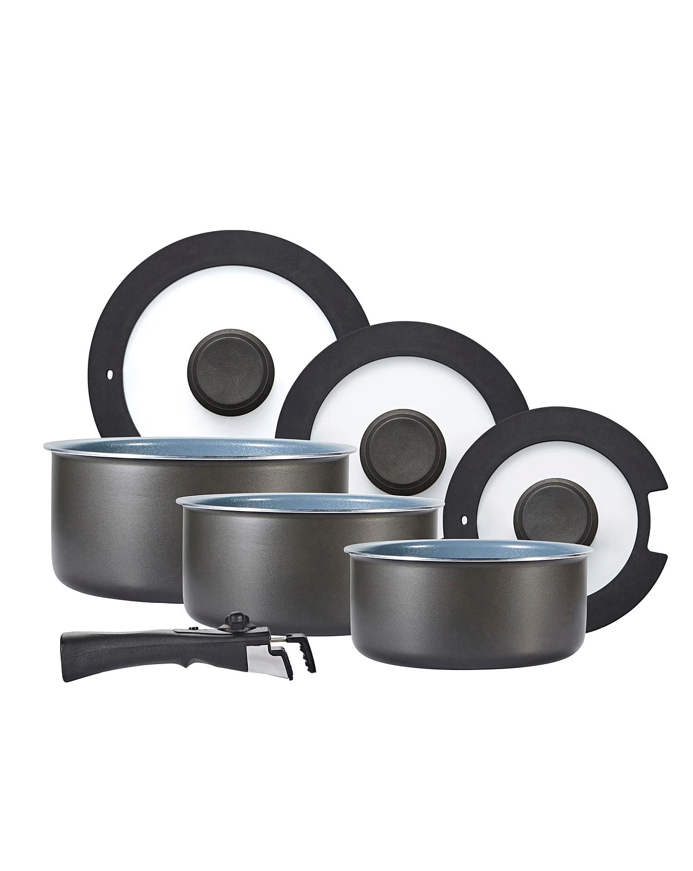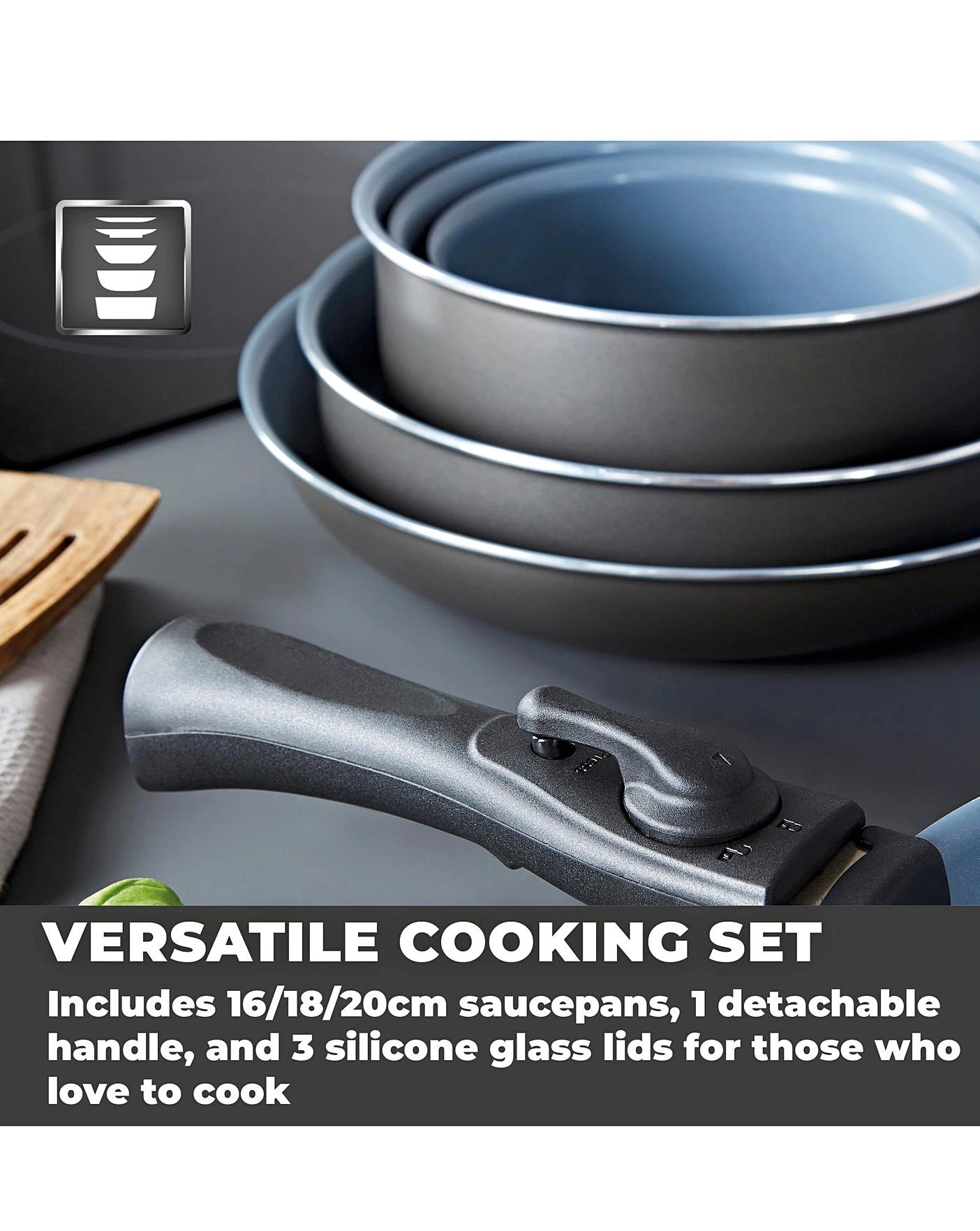 VERSATILE COOKWARE SET: Includes 16cm, 18cm & 20cm saucepans with glass lids and 1 detachable handle, adding versatility to everyday cooking